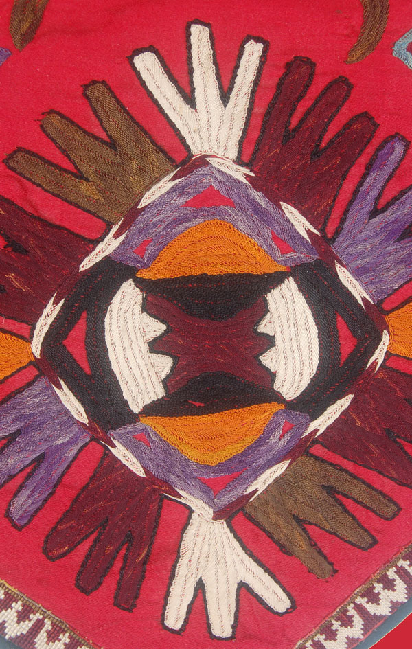 The Lakhai (or Lakai) are a nomadic tribe of Uzbekistan, northern Afghanistan and Tajikistan. They are known for their brightly colored geometric embroideries. These textiles are highly individualized, made up of abstract designs chosen by the women who made them. Some of these abstractions are sourced from the animal world, though they are expressive rather than representational. Motifs that can be described as scorpions, spiders, snakes, birds of prey and rams’ horns were commonly used, but the individual embroiderer had the freedom to alter these shapes and create her own composition as she saw fit.