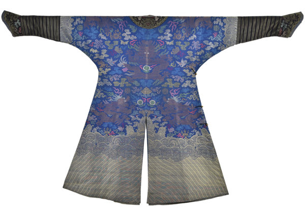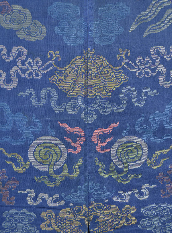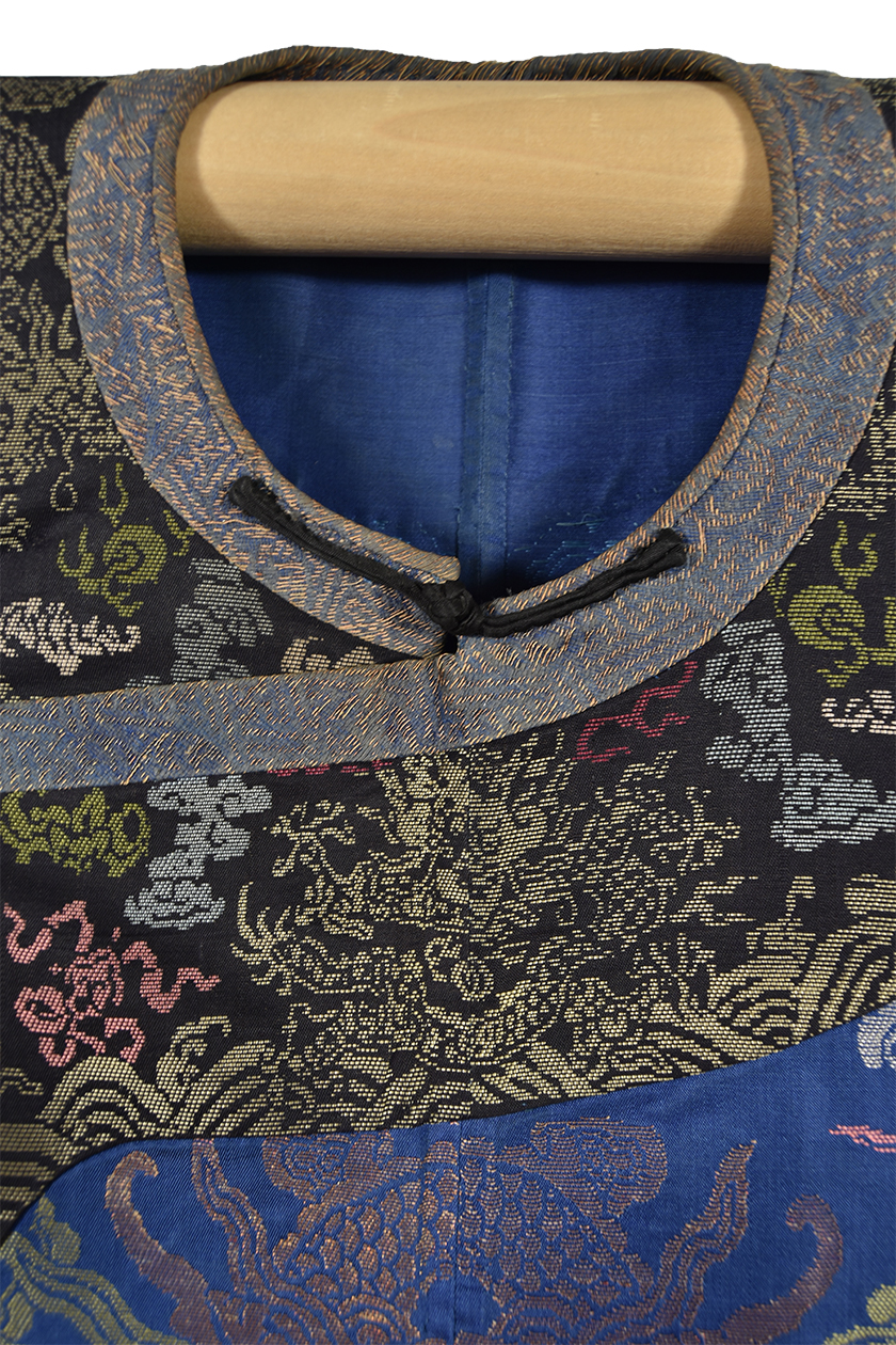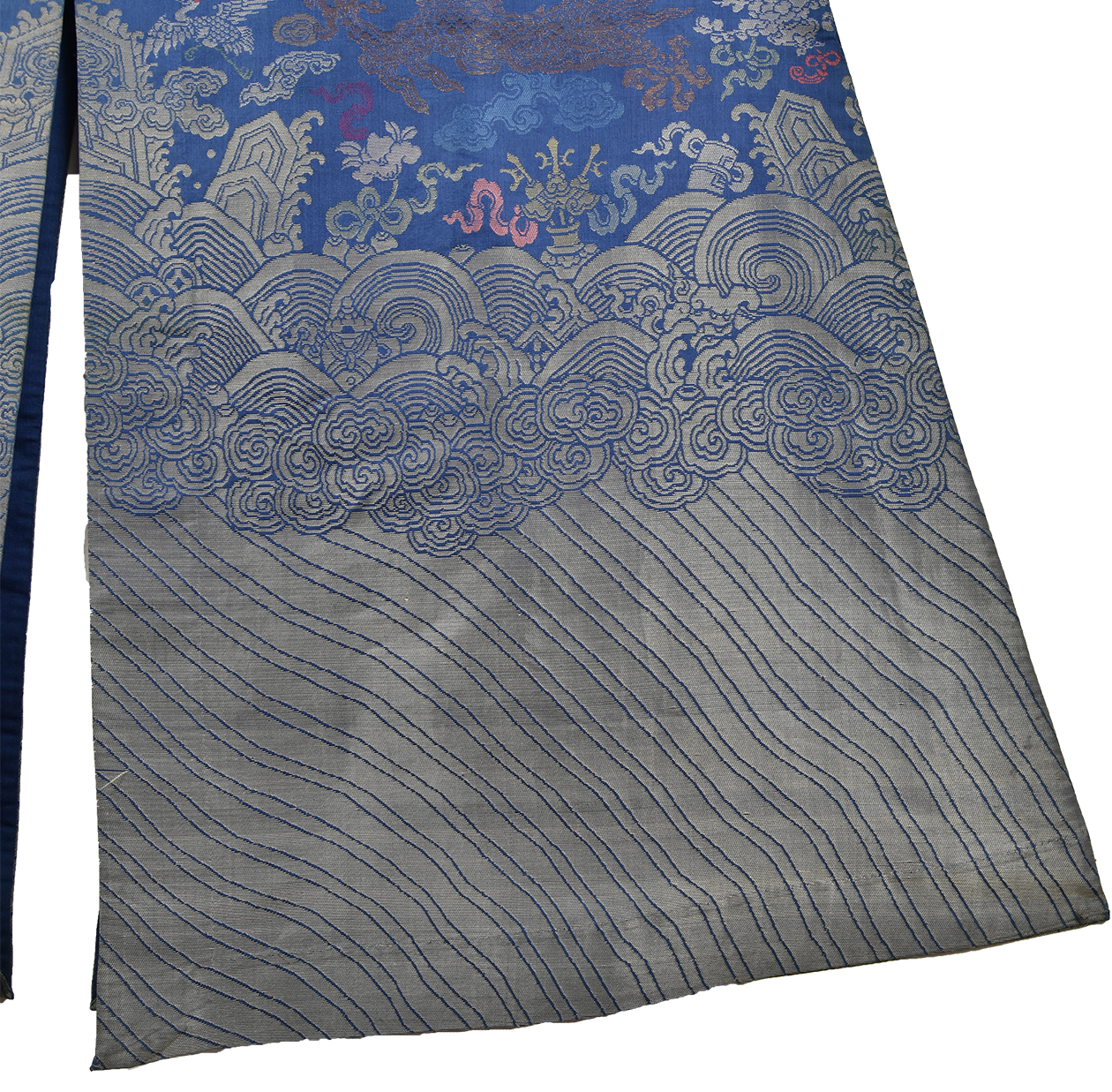 Formal nine dragon brocade robe. It features one front facing dragon center front and one on the back. Both are flanked by two side facing dragons. Two more dragons on the shoulders and one on the inner flap complete the dragon total to nine. They are all within a celestial landscape that includes clouds, mountains and waves. Within the landscape are phoenixes, bats and auspicious symbols.