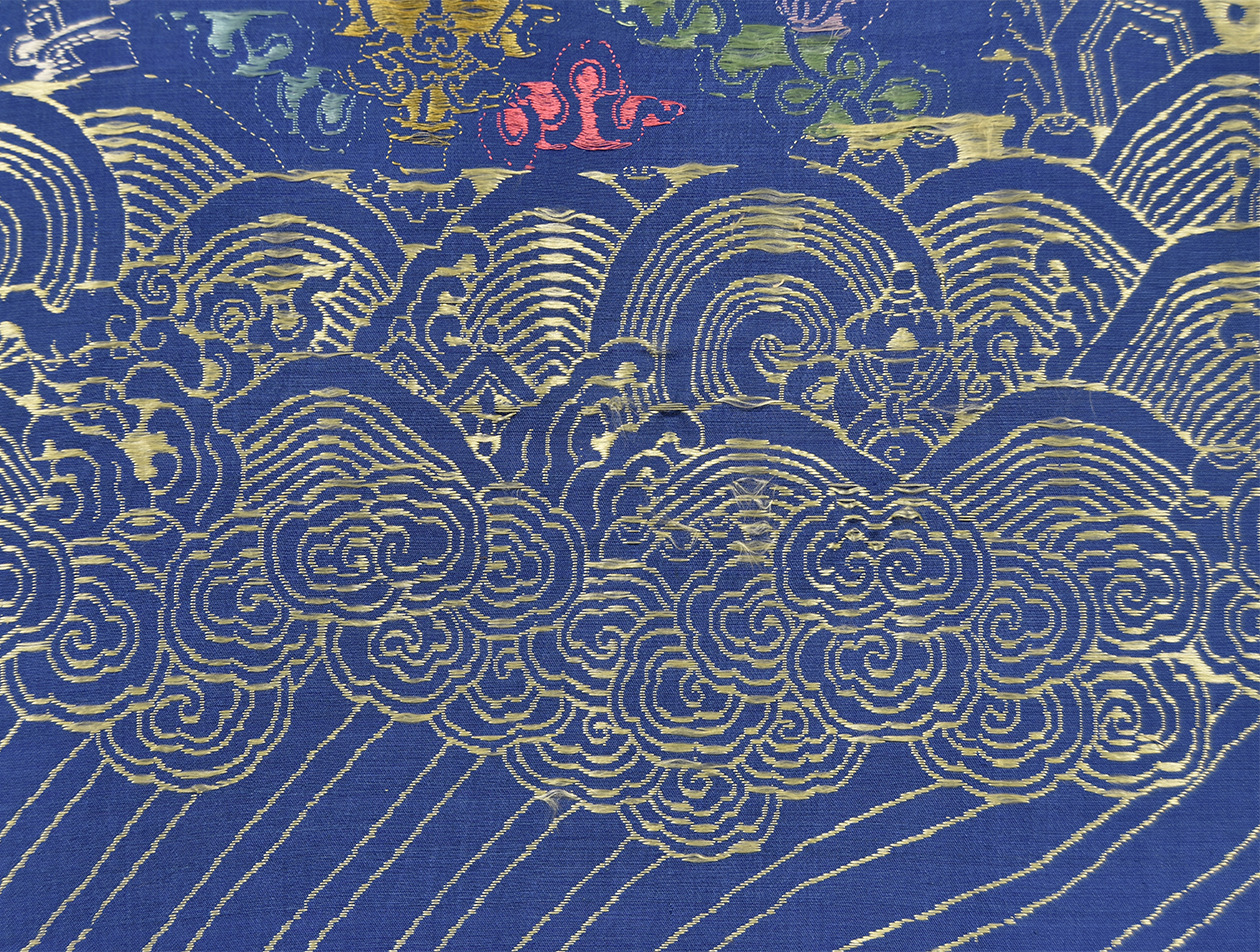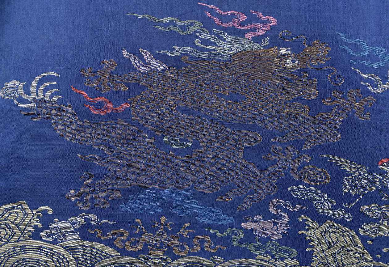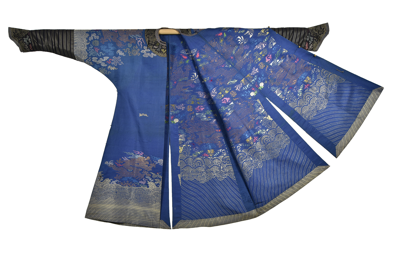 Formal nine dragon brocade robe. It features one front facing dragon center front and one on the back. Both are flanked by two side facing dragons. Two more dragons on the shoulders and one on the inner flap complete the dragon total to nine. They are all within a celestial landscape that includes clouds, mountains and waves. Within the landscape are phoenixes, bats and auspicious symbols.
