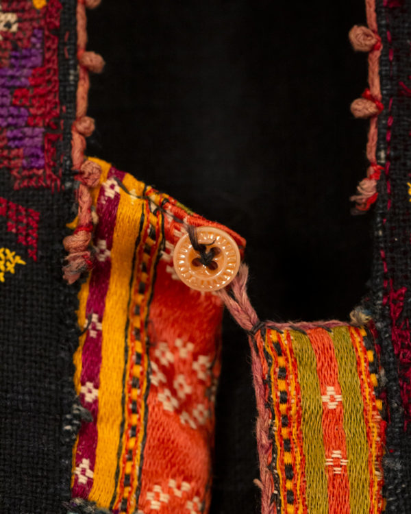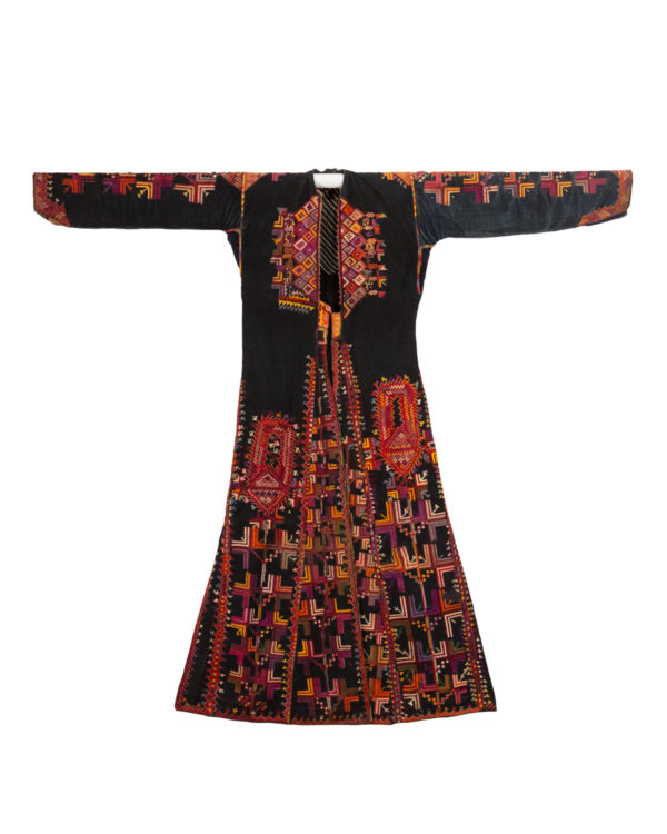 Polychrome silk embroidery decorates an indigo cotton ground coat. The sleeves are long and embroidered down the top of the arm and around the bottom of the sleeve. The coat itself is almost floor-length and has two side slits to allow for more movement.