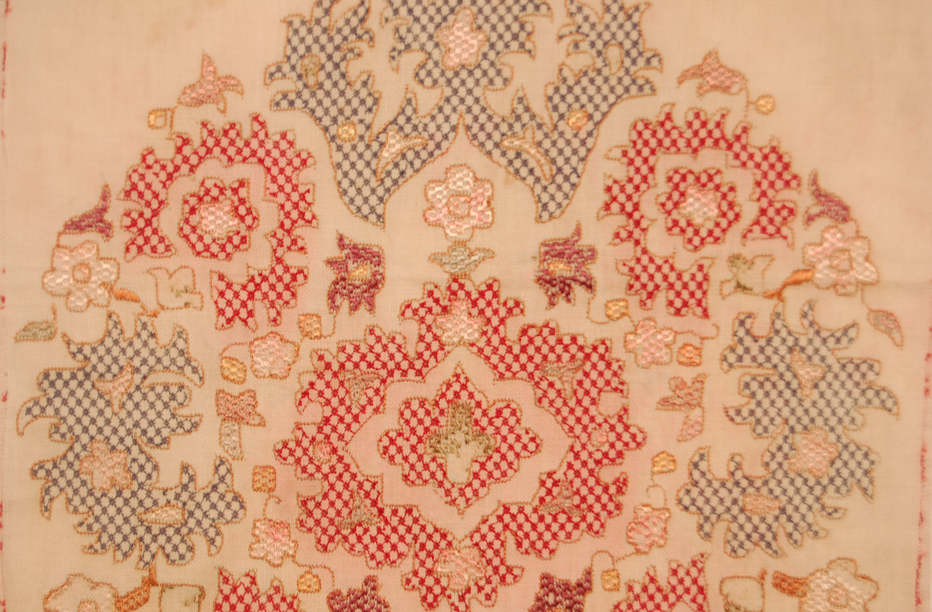 These professional embroiderers created floral shapes in red, blue, and brown using Algerian eye stitch, and leaf shapes using brick and satin stitch. They often outlined their work in black silk or gold thread. This fragment likely had a longer tasseled or fringed edge at the bottom where there are traces of colored threads. The X-design across the top and bottom edge is sewn in white basic stitches. The overall design is similar to a piece at the Arthur Sackler Harvard Art Museum.