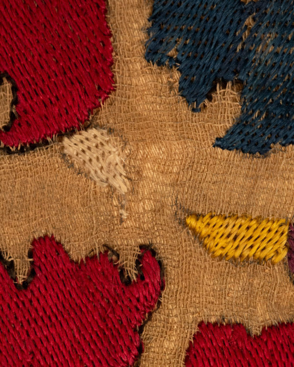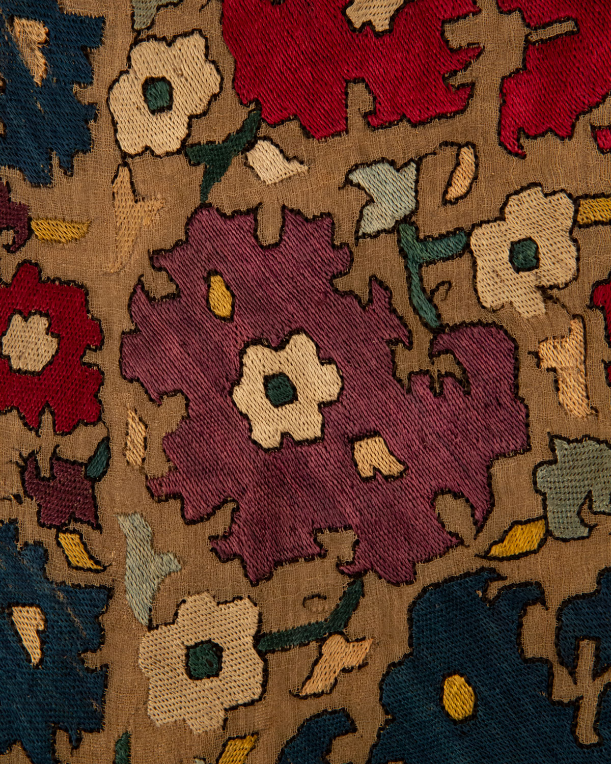 This embroidered panel was most likely used as a shawl and it is in complete form and in very good condition, due to the fact that it was backed onto a sturdy cotton probably in the 19th century.