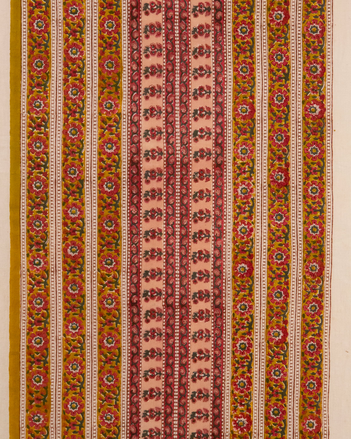 This piece was made to be a wall hanging based on the design of the borders, and was made in India for the Persian market. A polychromatic tree of life is centered and complimented by a mustard-yellow outlined arch. The piece is surrounded by an intricate block-printed border.