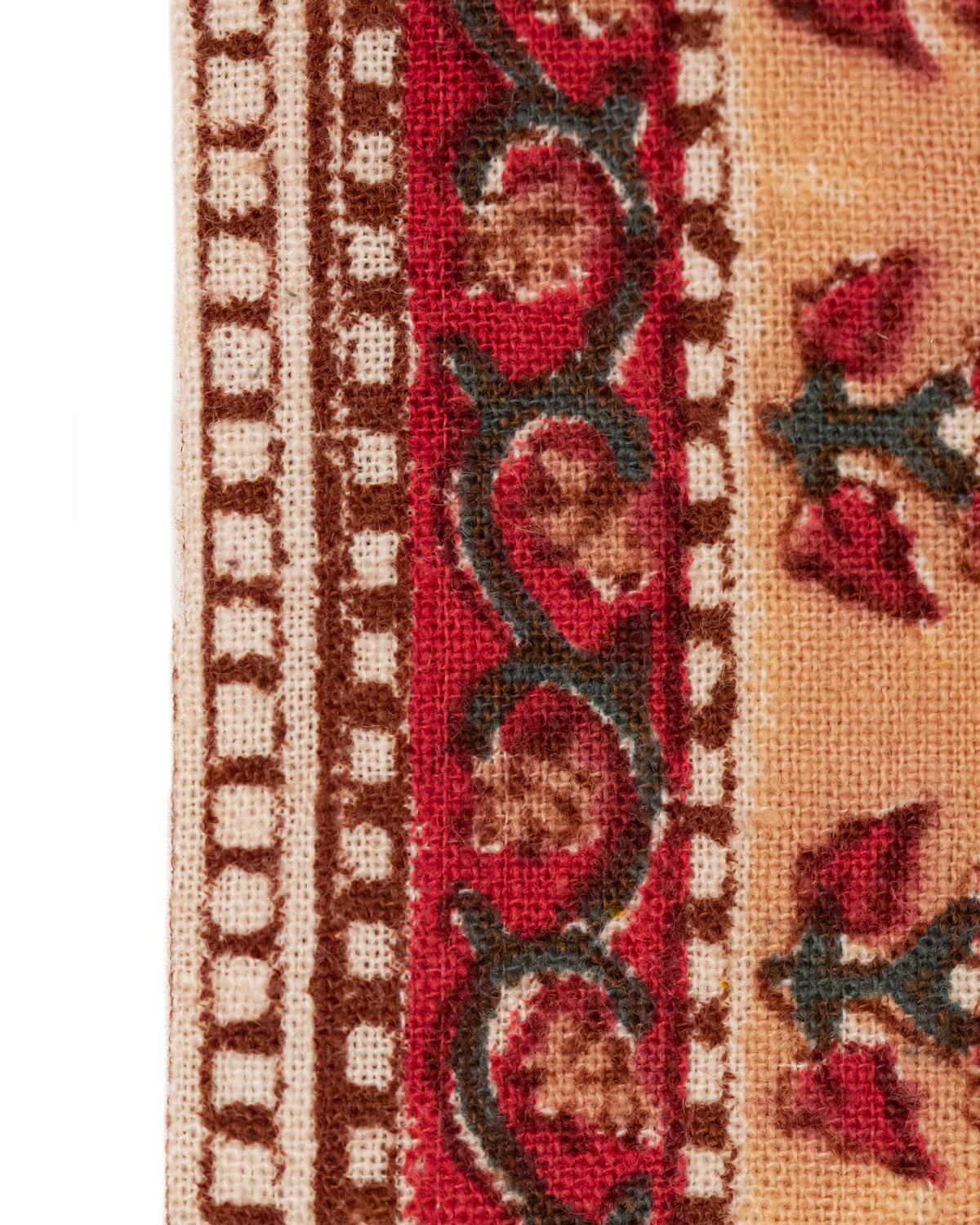 This method of block printing and hand painting has been dated back to as far as 3000 B.C., and is still practiced today in both India and Iran. The process takes 23 steps- naturally bleaching, washing, and softening the fabric, then drawing on the black outlines, washing again, and adding color are some of them. Traditionally, natural dyes were used, so they typically had the same color palette of rust, mustard, indigo, green, and black.
