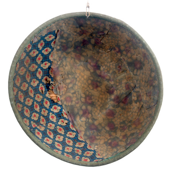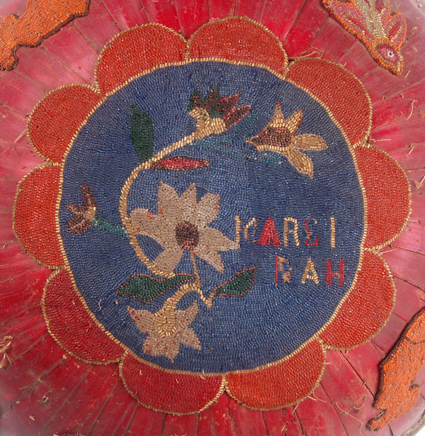 Domed food cover made of banana leaf and decorated with glass and metal beads. Lined with patterned cotton.