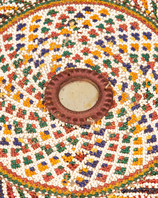 This beaded fan is from Gujurat, India. While some handicrafts in Gujurat were done by men to make a living, beadwork was traditionally done by women as a hobby. This fan is created by hand by painstakingly sewing together rows of beads to create a polychromatic geometric pattern. A mirror was added into the middle for either decoration, or for the user of the fan to look at themselves.