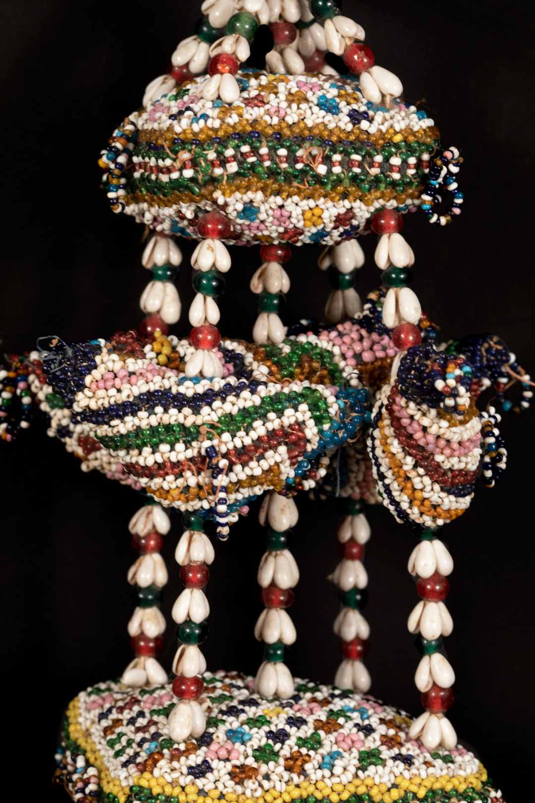 Hanging bird ornaments were hung in doorways or windows to bring prosperity and good luck to the home. One large hen sits at the top, covered in polychromatic hand-strung beads. Smaller hens hang below it, along with other beaded ornaments and small shells.