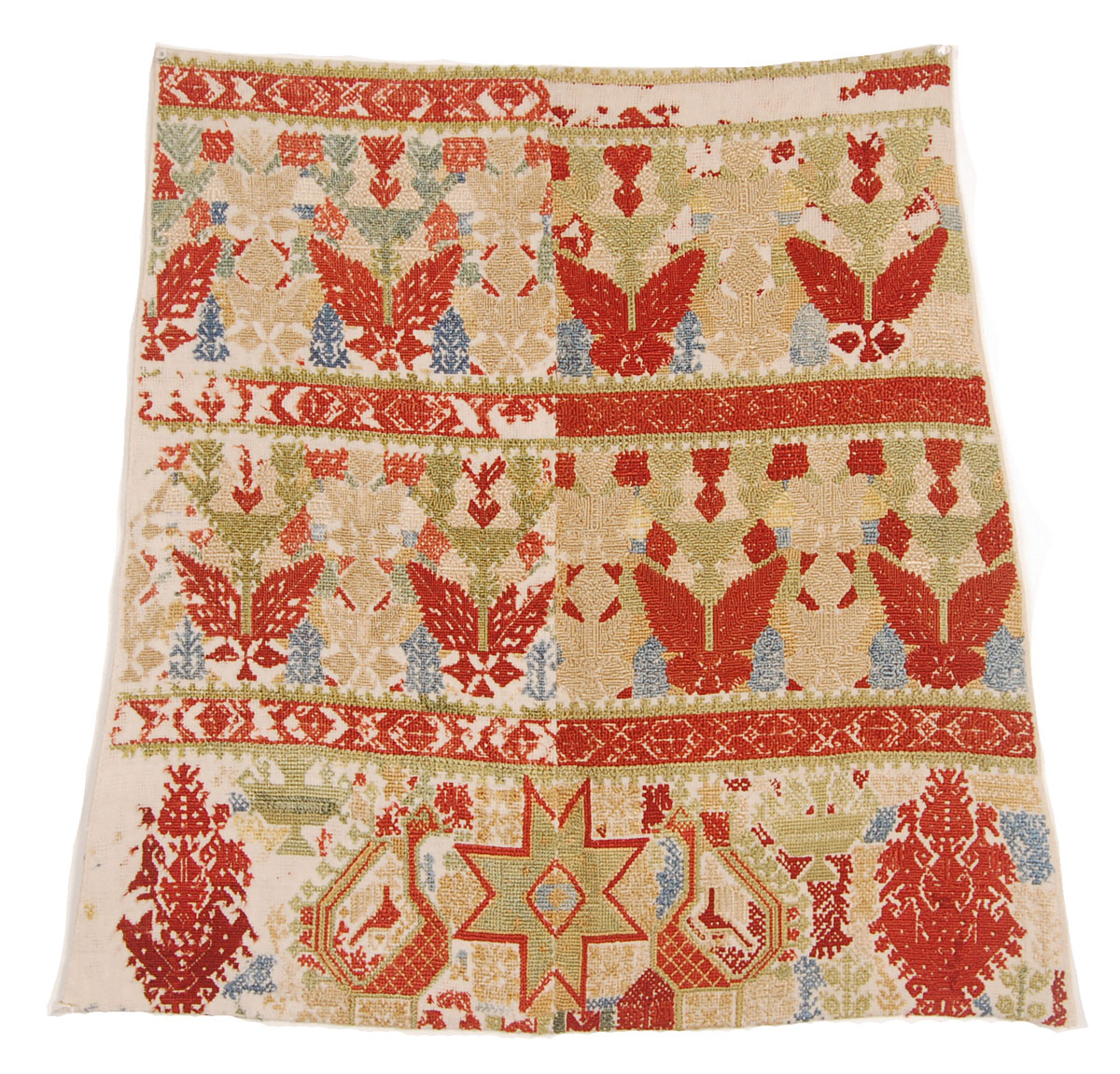 Fragment of an embroidery that is most likely a part of a bed tent panel. The three main design bands depict abstracted flora and leafy branches in green, beige, blue and red. Bordered by simple red geometric bands top and bottom.Floss silk embroidered on linen in Rhodian cross stitch.