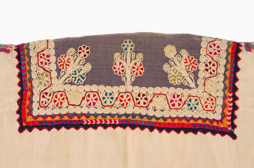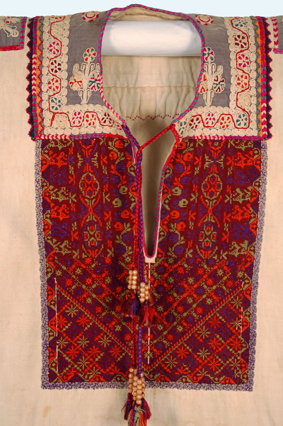 Embroidery is the Palestinian craft par excellence and has become known worldwide as a symbol of the Palestinian people.Embroidery was applied to various parts of a trousseau that each girl worked on and brought into her marriage. The style of the embroidery identified its wearer as a city dweller, a nomad or a villager and each city and village had their own variation of style and motifs. The village of Bet Dajan, south east of Jaffa, became affluent in the first half of the 20th century and as such had ostentatious styling and its embroidery work was mostly commissioned from professional workshops in Bethlehem. The decoration can be identified by the bottom back of the skirt which is covered with rows of cypress trees. The purpose of the seam across the front is to facilitate maternity.