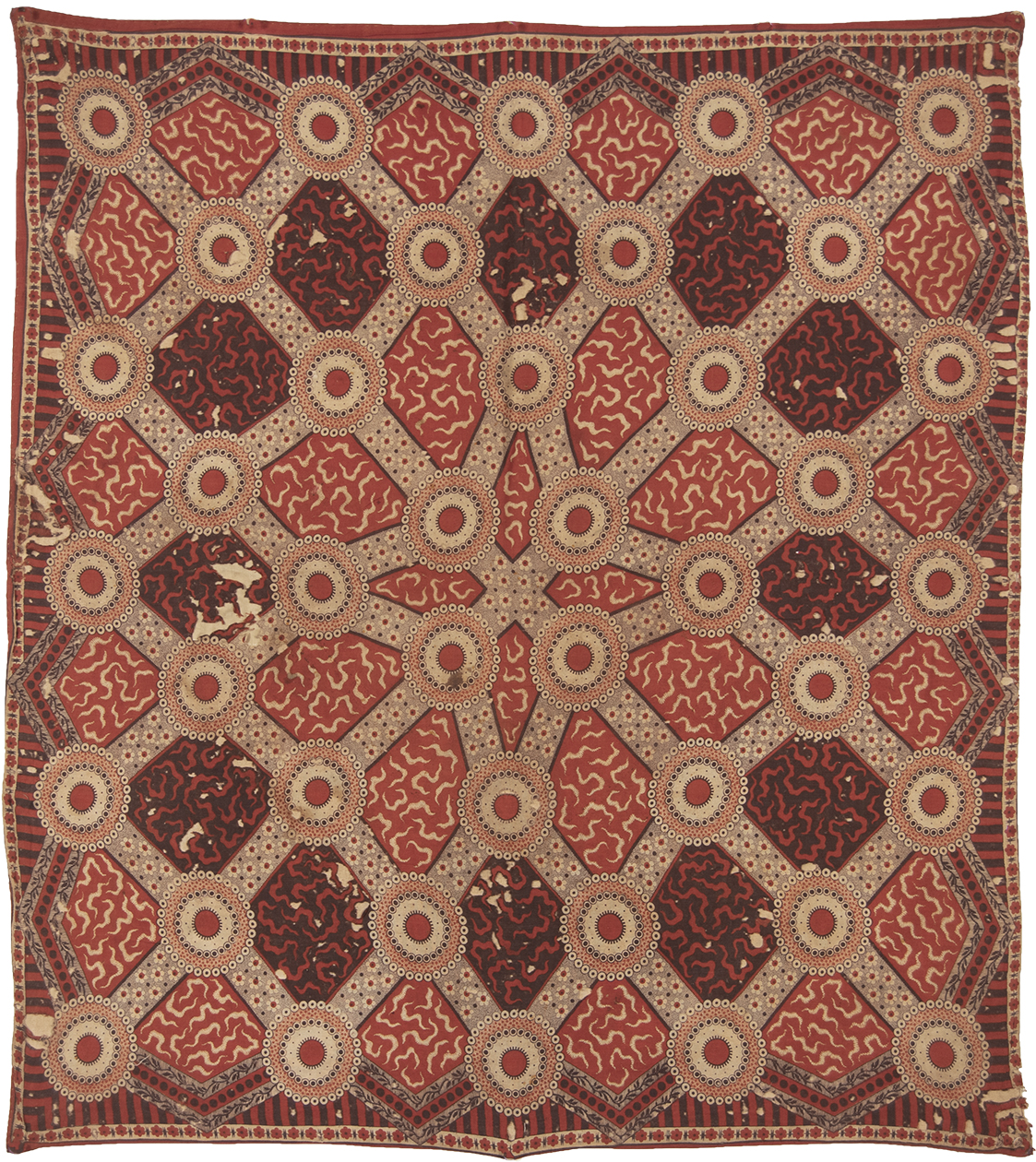 This cotton kerchief has various floral, circular, and abstract red and brown designs roller printed on to a beige base. It is in fair condition with small holes as shown in the photos, and is stabilized with cotton backing.