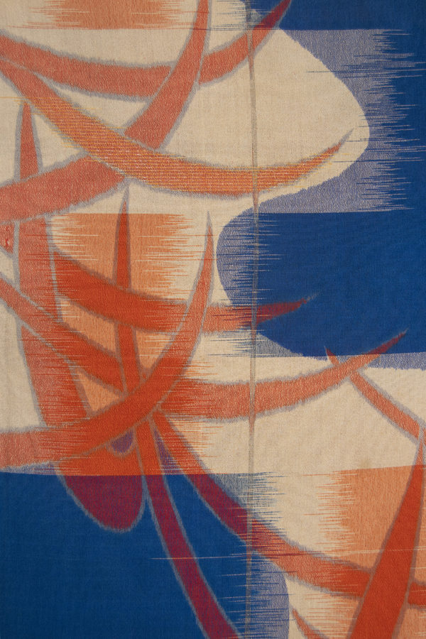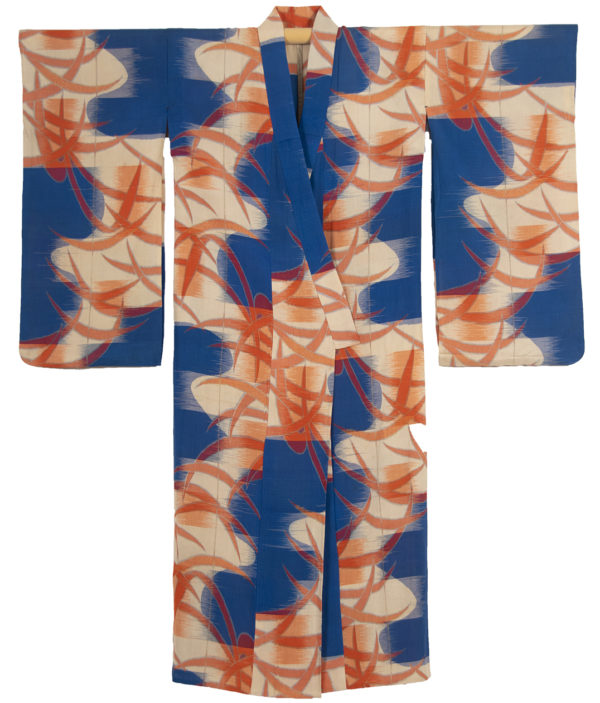 Instead of tie dyeing, the silk was woven on mechanized looms and while on the loom, before been woven, the yarns were stenciled printed to give the ikat effect. The Meisen technique was very popular at the beginning of the 20th century and fell out of favor only when Japanese women started wearing western clothes after the second world war. This Kimono is made of silk and has a blue and white base with a coral, geometric but grass-like design.