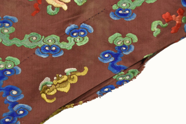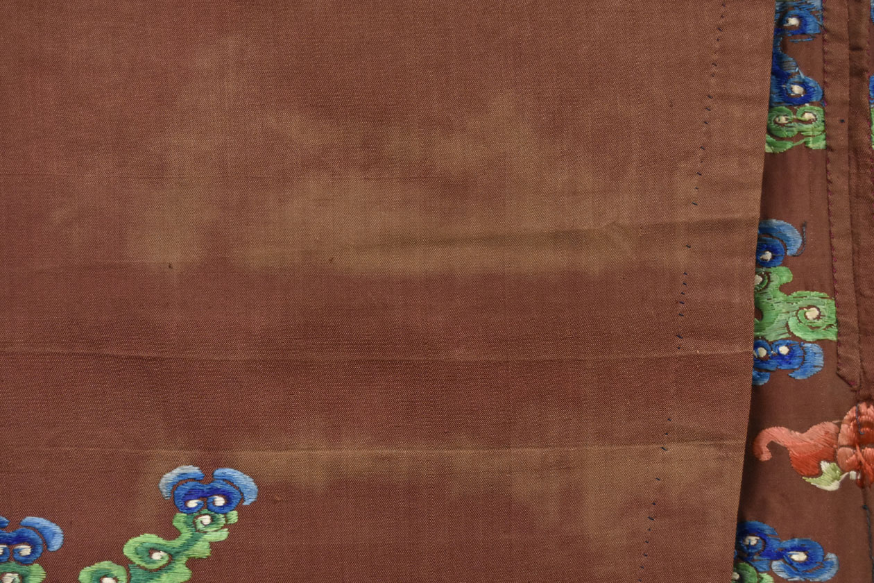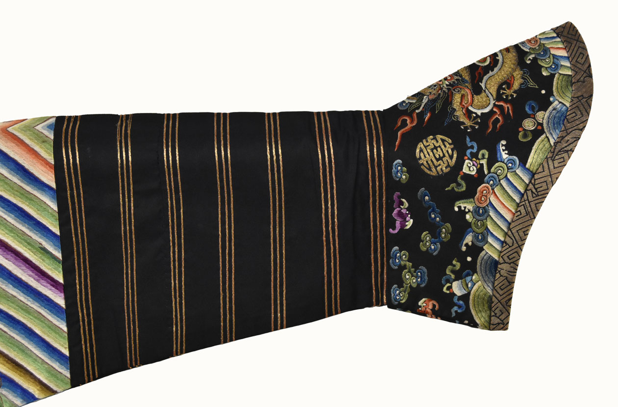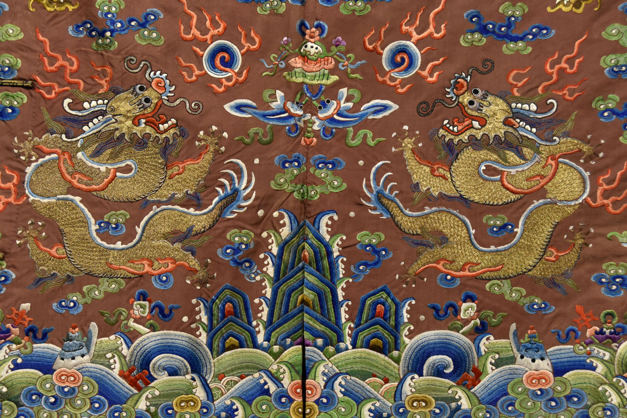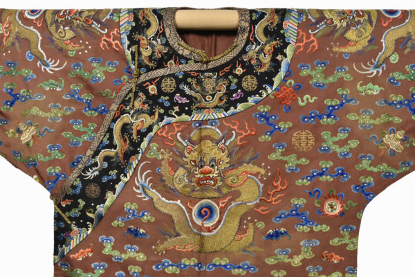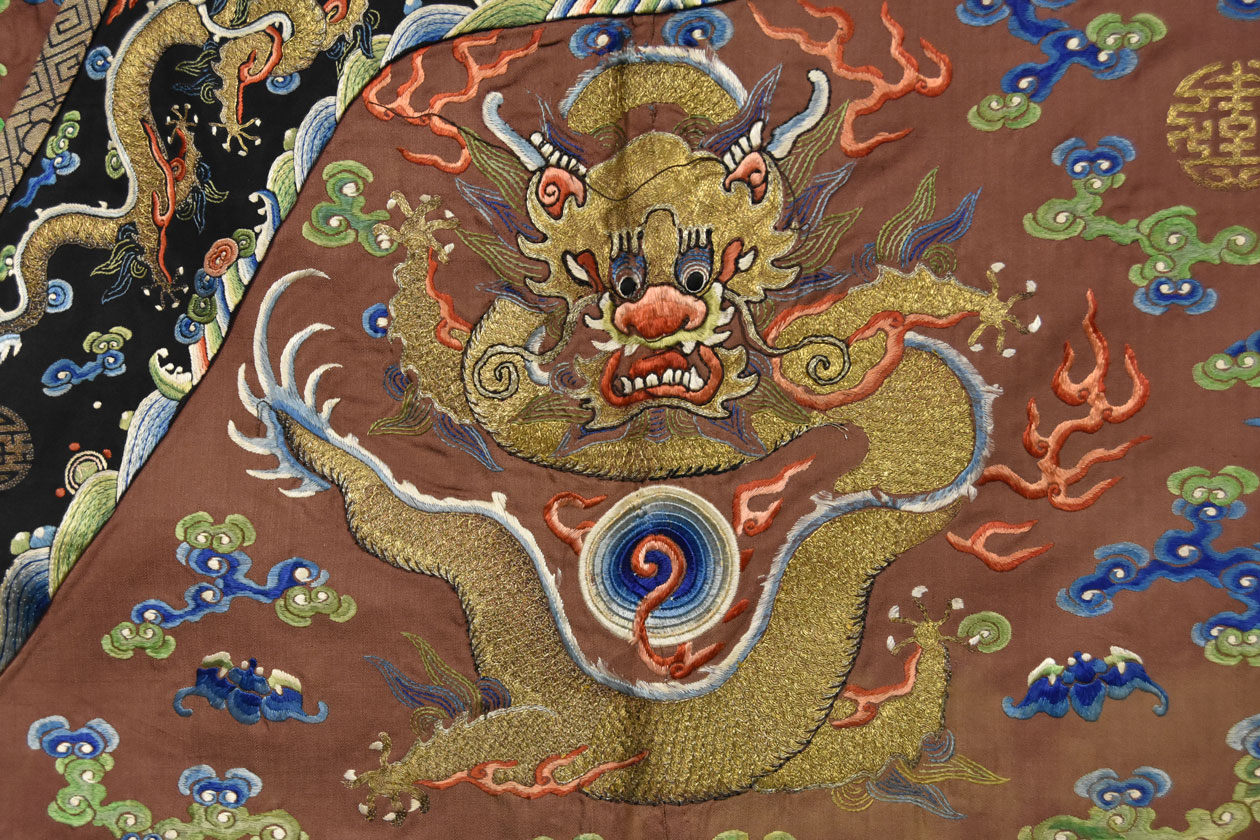 The robe is decorated with a terrestrial landscape featuring nine five-clawed dragons. Three in front, three in back, two on shoulders and one on inner flap.The edgings and cuffs are embroidered with imperial motifs as well.