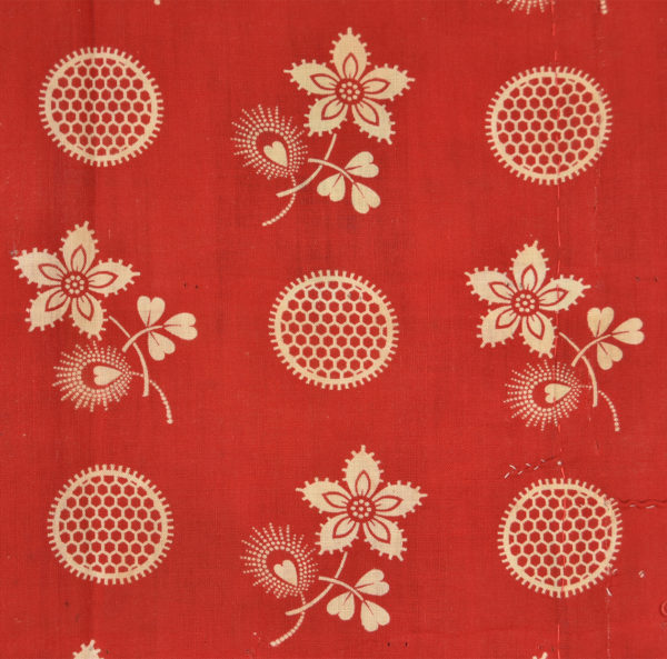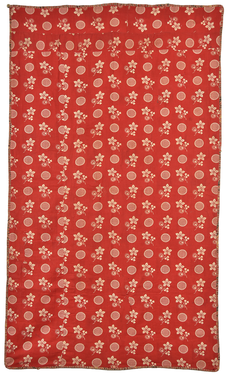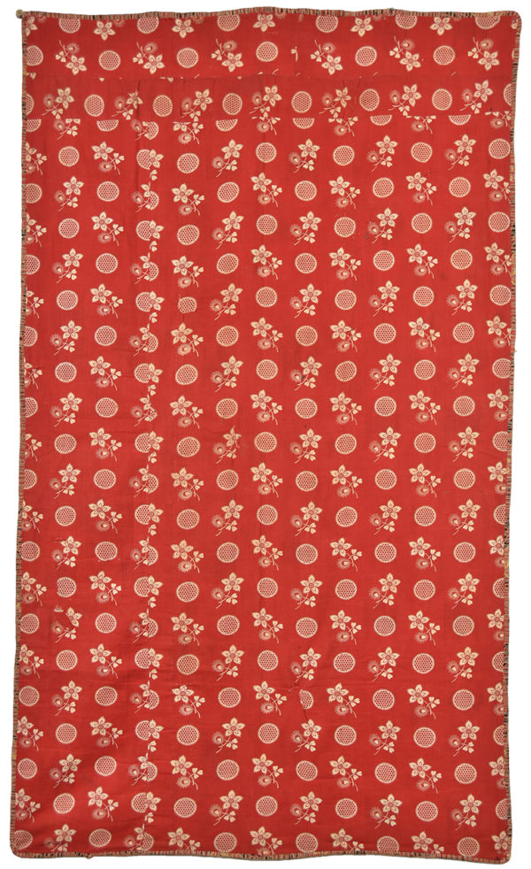 A six-color ikat panel comprised of three strips sewn together vertically. The linear design of alternating rows of crosses and diamond shapes.Russian chintz backing.