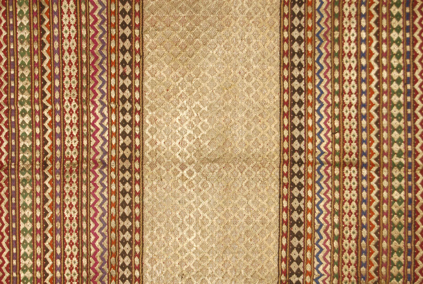 Weft faced silk brocade from Sindh province. This fragment is a part of a shawl or a sash originally worn by men but as of the middle of the 19th century these complicated and showy items were made for the tourist trade. The linear design features silk stripes of various widths with a supplementary metal weft that fills the stripes with saw tooth, zigzag and diamond shape motifs.