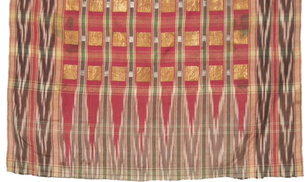 The term kanavat refers to silk shawl tied dyed in the warp ikat technique which was imported to Russia from Persia. The ikat design of the kanavat has a large striped field with wide borders decorated in a zigzag motif. The ikat designed is complemented by a discontinuous supplementary weft brocade executed with fine metallic thread. The gold thread design is superimposed on the ikat ground with squares in the center field filled with a diamond design. The coloration is usually of rich red, aubergine, green and dark brown enhanced with the reflective gold of the brocade.
