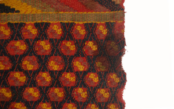 This panel is one of two or three that would have comprised a huipil, or blouse, for a Guatemalan woman. The colorful, geometric pattern was produced, while weaving, in the form of supplementary wefts. The technique seen here is known as single-faced brocade and only shows on one side of the red cotton ground. The village in which a huipil was made can often be determined by its design. Motifs on this panel, particularly the multicolored zig-zags, dots and lattices, are characteristic of San Antonio Aguas Calientes.