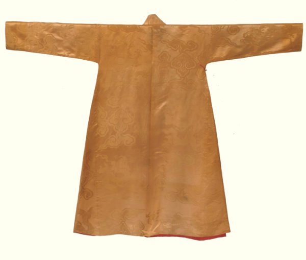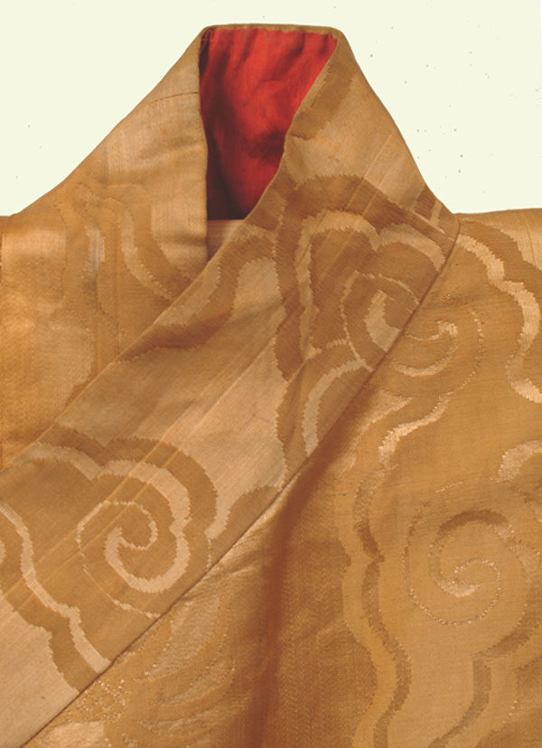 A robe of rust silk in a stylized cloud and dragon design. Lined n brown cotton. Generous proportions.
