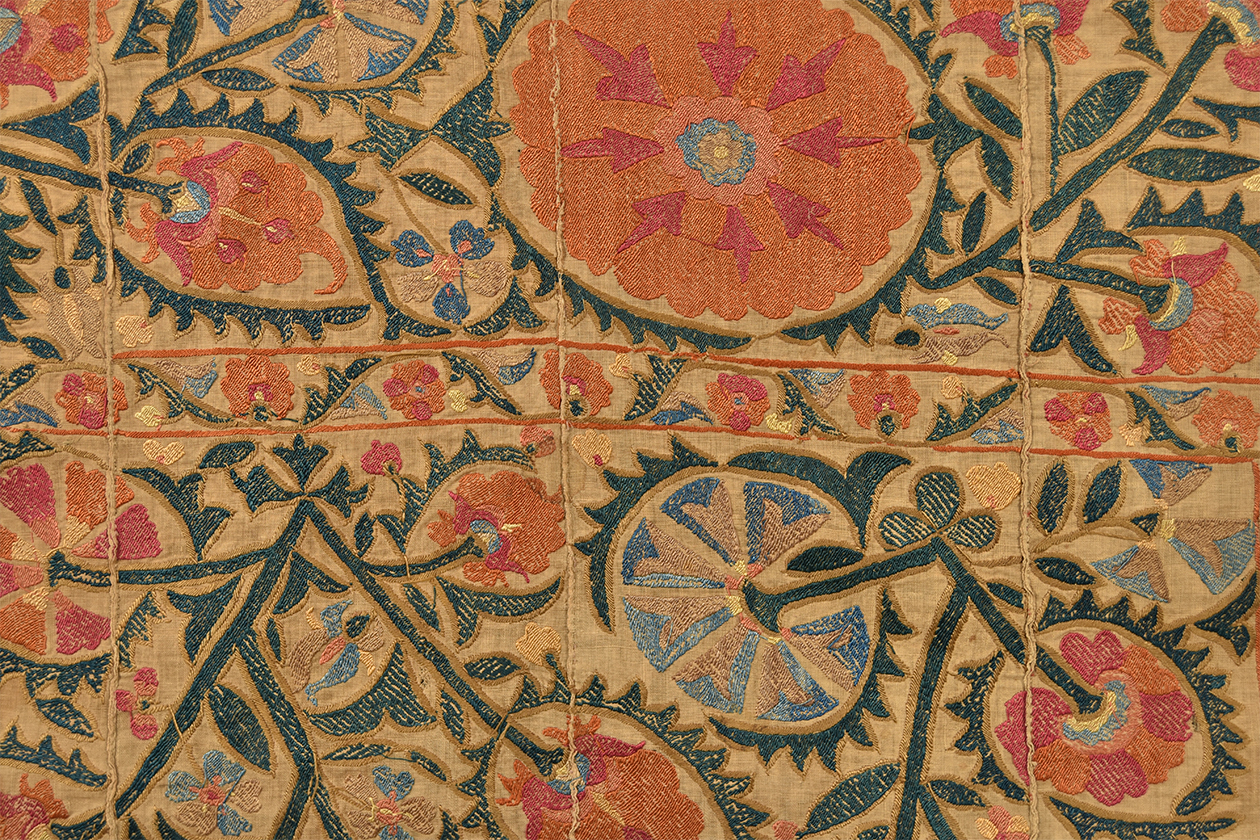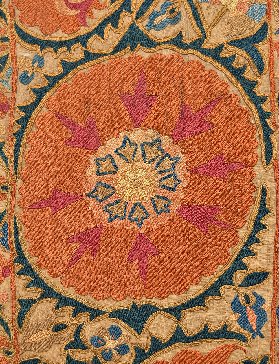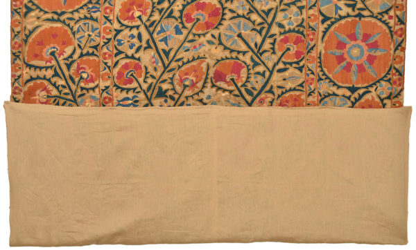 Starting at the 18th century and all the way to the beginning of the 20th century suzanis were the most widespread household textiles in central Asia. They were mostly made by females of one household preparing a dowery cloth for a bride to be. Each female would work on one long panel on a drawn design. Once completed the panels would be stitched together lengthwise to form a large cloth to be used around the house as a bedspread, wallhanging or other utilitarian purposes. As each embroiderer pulled differently on the stitches and used different dyes, the registry was off and colors didn’t quite match, thus contributing to a certain vibrancy that is very appealing.