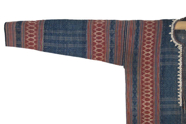 Like other Sumatran jackets, this one is simple in construction as the woven patterning is what it is all about. The fabric was originally woven in one piece with the sleeves cut from one end. The weaving starts with the tapestry band that decorates the bottom back.. There the weft threads are placed repeatedly in one small area to create oval shapes and curving lines. The rest of the weaving features broad bands of deep red and blue. The blue bands have a supplementary weft pattern of archaic grid while the design on the red bands has two vertical snaking lines that meet in the middle to produce a pattern of vertical lozenges. Braided attached collar and white cowrie shells along the edges complete the extraordinarily complex nature of this jacket, which no doubt belong to a person of high social status.Southern Bengkulu, Sumatra.