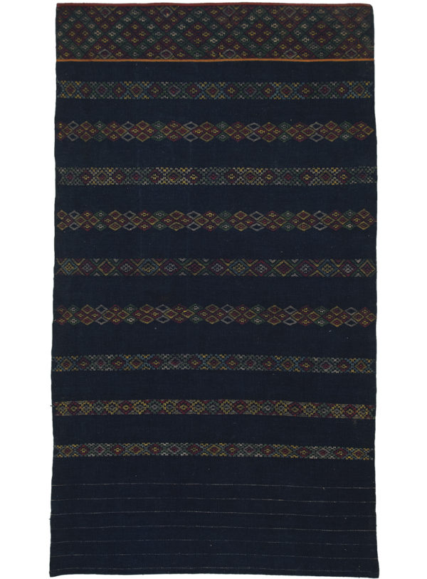 The ground of the piece is made of cotton and dyed with indigo several times to become dark blue. They are decorated in a linear scheme with a row of geometrical shapes that are embroidered in polychrome silk. The counted stitchwork is so tiny and precise that it almost looks like a weave.