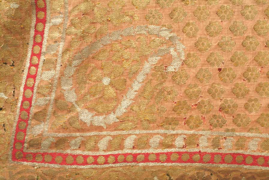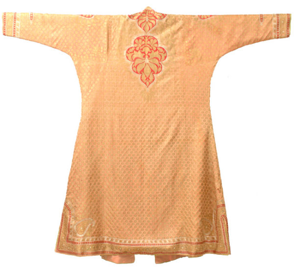 A dignitary s robe of generous proportions made of sumptuous brocade incorporating real silver and gold thread. The pattern for this coat features a large medallion in the back, botehs in front on shoulders and all corners. An outstanding example of Benares brocade.