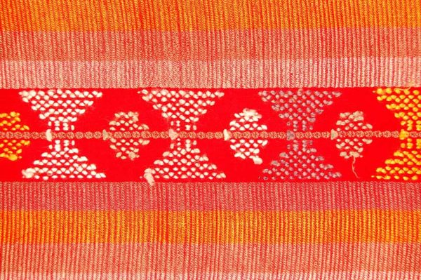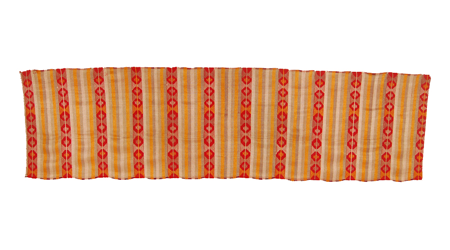 Ceremonial skirt from Samayac,Guatemala. Unlike other regional skirts was worn wrapped without a sash. The striped tabby ground is decorated with a supplementary weft. Weft is selvedge to selvedge and quite narrow. Along the edges, which curled onto themselves but now are ironed flat, one can see the original colors before they faded into the stunning abrash that they are now. A design of linear nature with rows of stripes, some plain and some containing hectagonal shapes. The luxurious shimmering effect is achieved by using heavy floss thread in a very loose weaving.