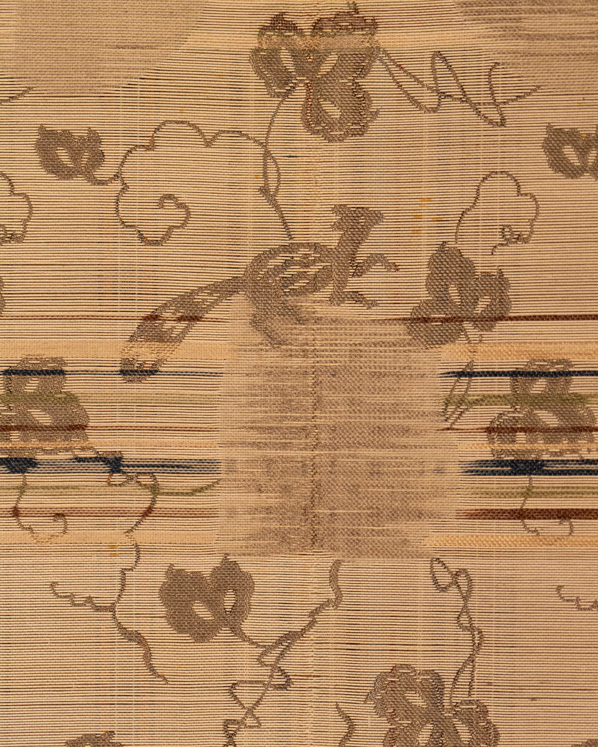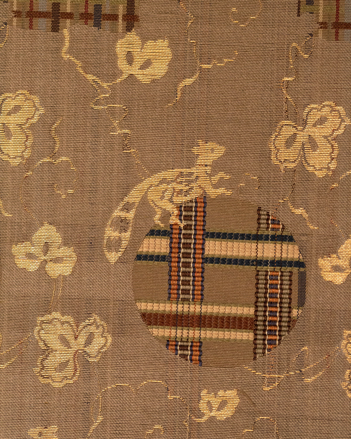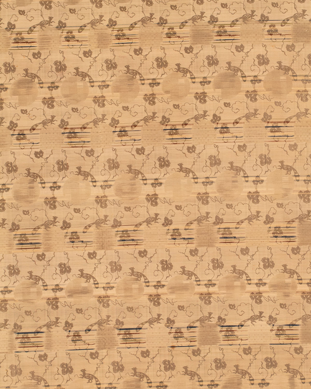 This brocade made for the European market is decorated with squirrels and grape vines in a scatter design around circular  shapes containing geometric overlapping line patterns. The ground is a gray silk, with polychromatic linear patterns, and the main motifs are highlighted in gold.