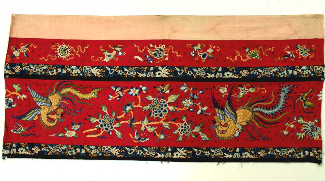 This Chinese embroidered valance was made in the early 20th century out of silk, metallic thread, and sequins. The dark red silk ground is embroidered with phoenixes, butterflies, and flowers.