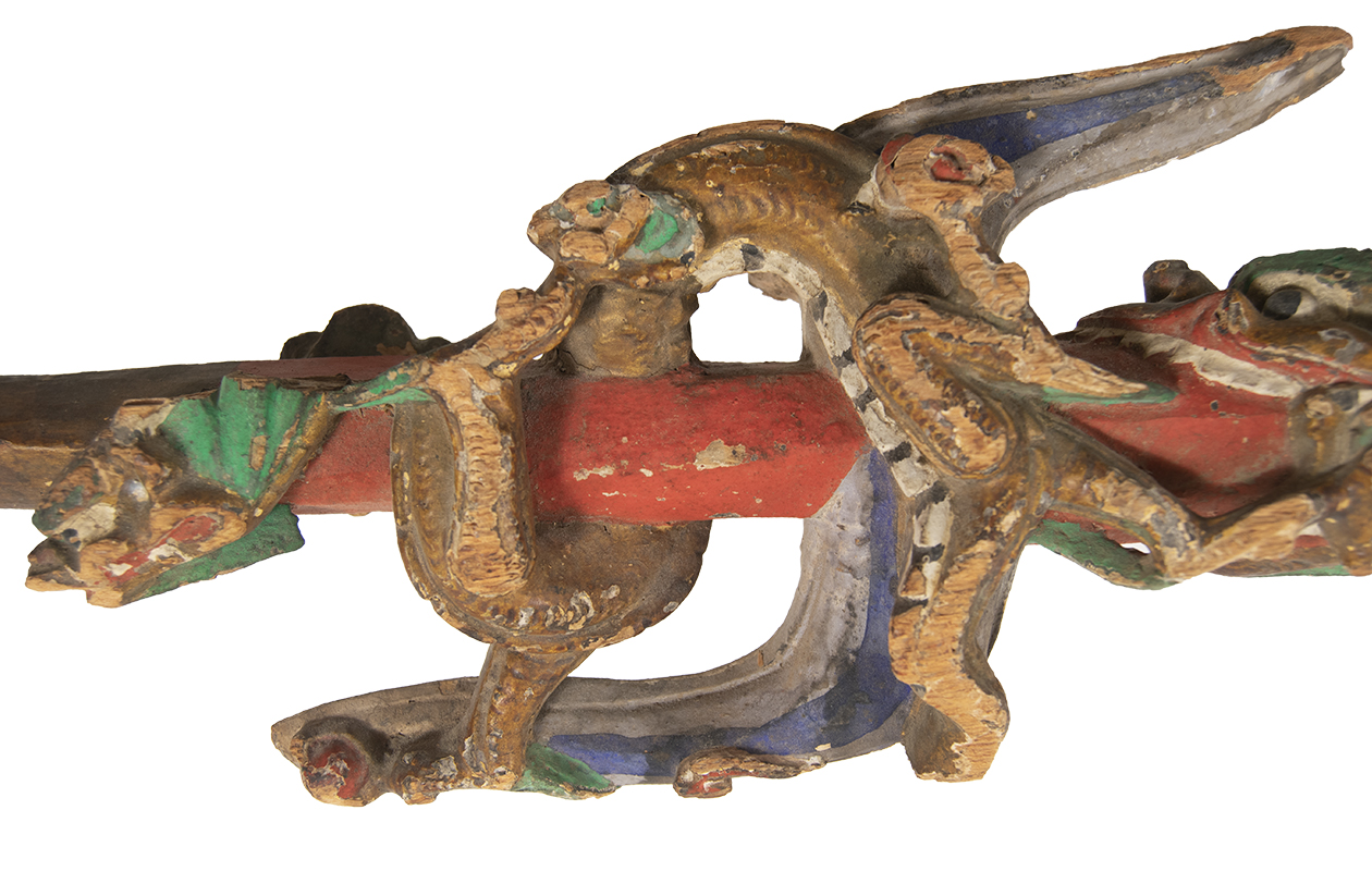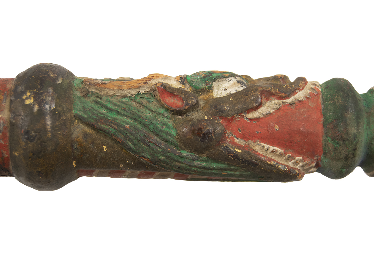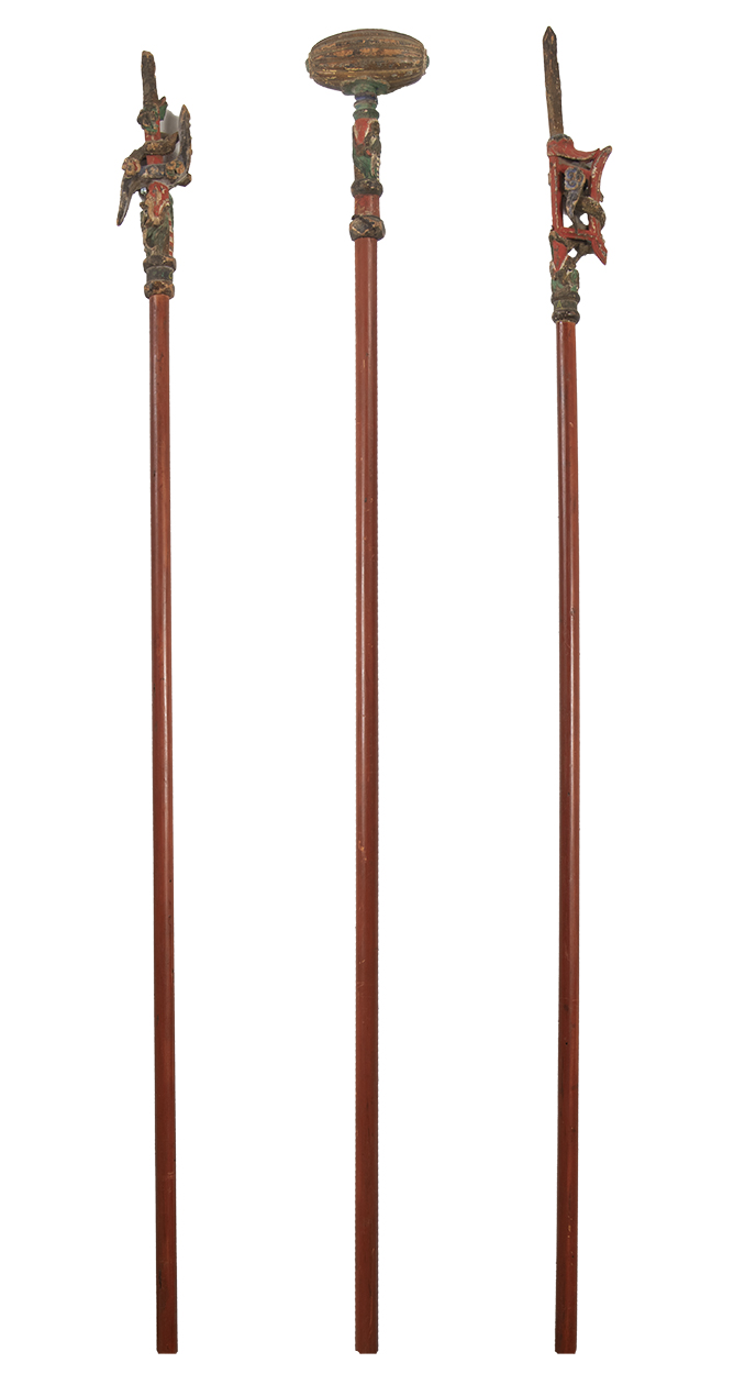 These staffs are made of carved wood. Each one has a dragon’s mouth opening where the staff meets the symbol on the top. The two smaller staffs have dragons on them, and the larger one is an unknown blimp-like symbol.