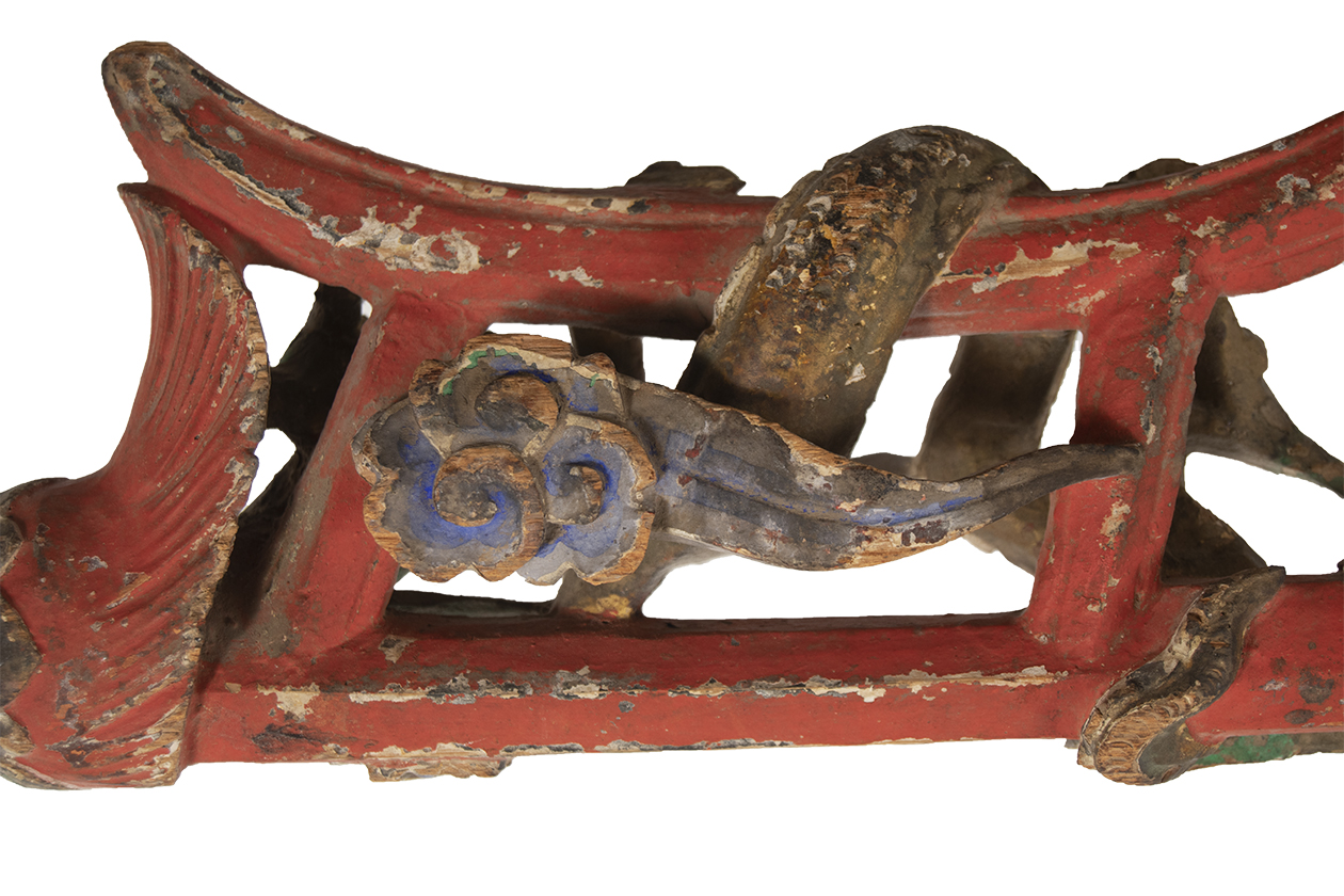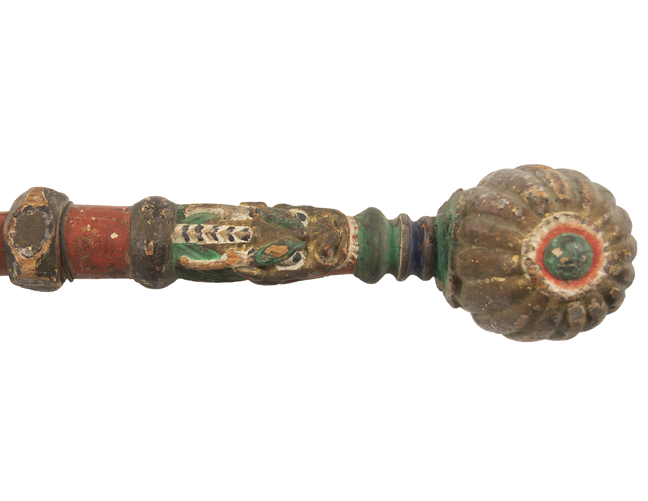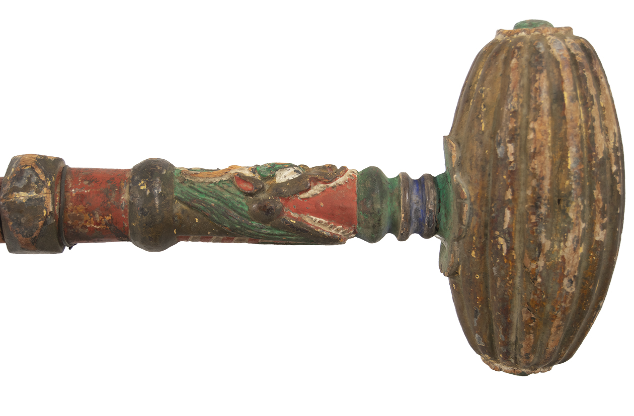 These staffs are made of carved wood. Each one has a dragon’s mouth opening where the staff meets the symbol on the top. The two smaller staffs have dragons on them, and the larger one is an unknown blimp-like symbol.