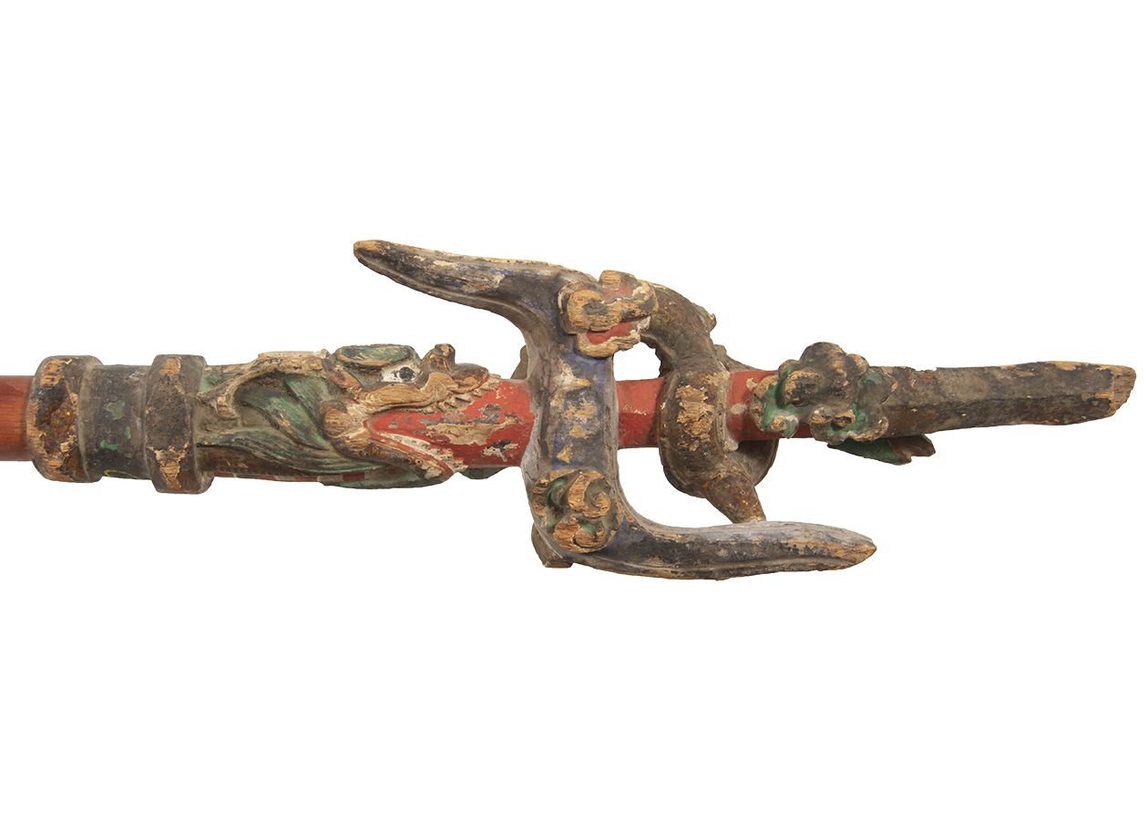In Chinese theater and opera performances, the stage was often bare with no set pieces. The focus was always on the performers and they wore extravagant costumes and makeup with some props. These technical elements would let the audience know their character’s traits. The male roles were divided into four groups: laosheng (older men with beards), xiaosheng (younger men), wensheng (scholars and officials), and wusheng (fighters). The groups of female roles were: laodan (older women), qinyi (aristocratic women), huadan (servants), daomdan (warriors), caidan (comedians). Every group would have a distinct look and action that would distinguish them from the rest of the performers. Props such as these judicial staffs would likely be used by the laosheng or wensheng, to display their power and status.