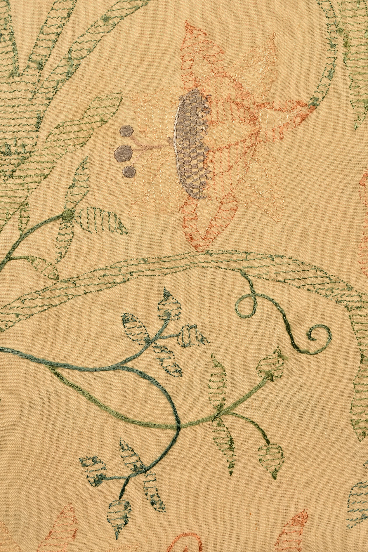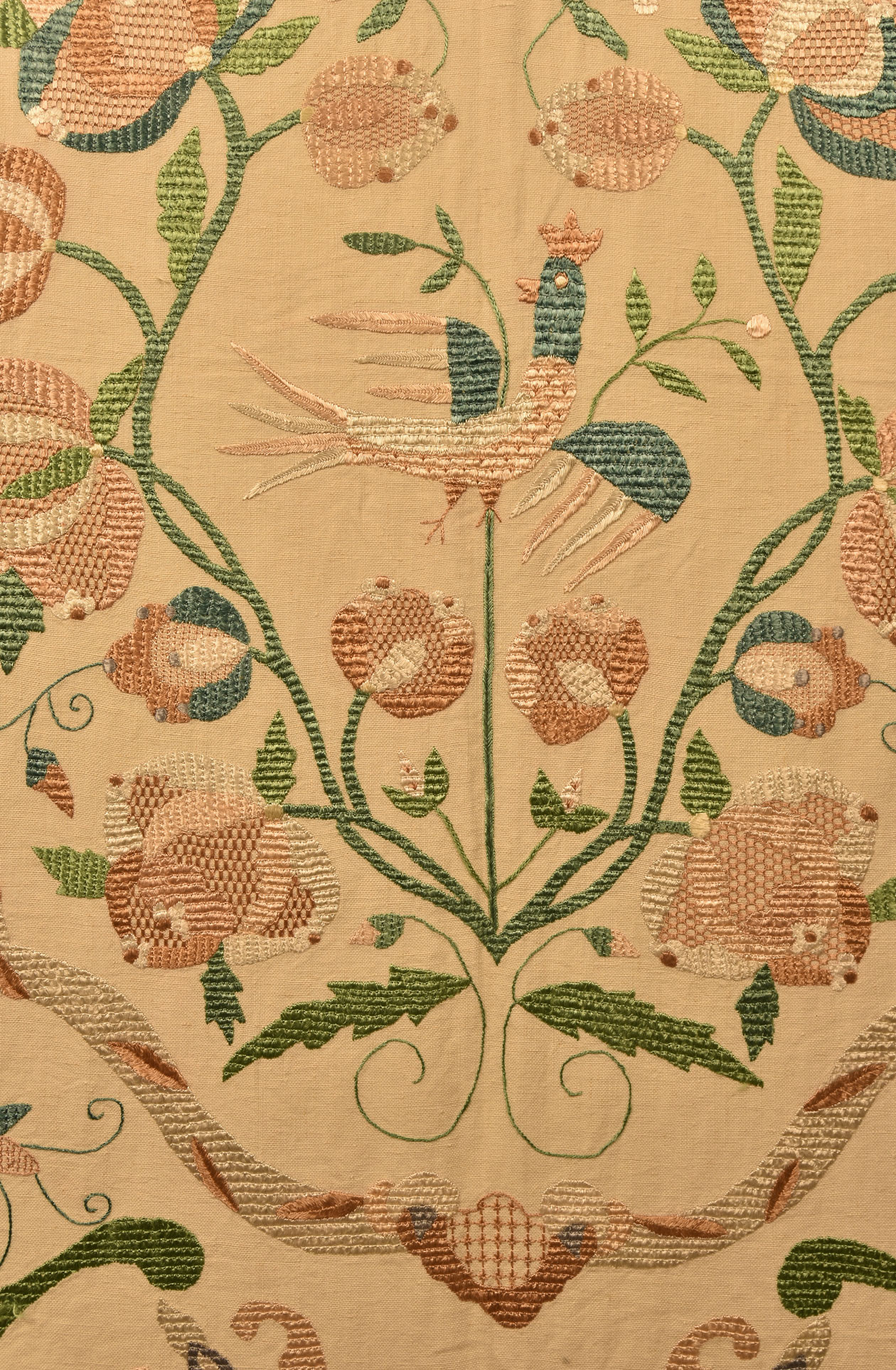Castelo Branco embroideries show the Indian influence in their themes. Tree of life is a prime motif as are large exotic flowers and smaller figures or animals. All very Indian in style but the stitching is European. The silk is uncoiled and thick, and the stitching is long and held together with overall couch embroidery. This contributes to large, smooth and reflecting surfaces that make these usually large panels shimmer in the light.
