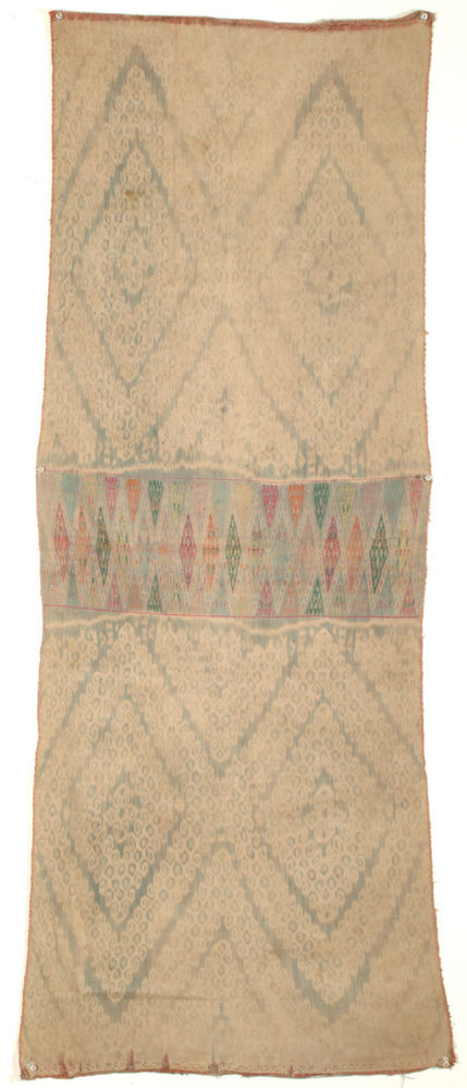 A cotton hipcloth patterned in warp ikat with a supplementary weft band of diamond shapes of varied colors.This weaving method is called Songket and it usually is a silk with supplementary metallic thread.This sample is cotton on cotton.