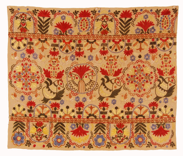 The motifs are easily recognizable and include double headed eagles, vases of carnations with birds on either side forming a tree of life and human figures wearing crowns. All these motifs are present in this example, executed on a cotton foundation with polychrome silk in a variety of techniques including satin stitch, chain stitch and cross stitch.