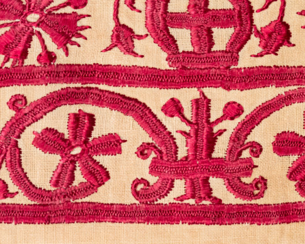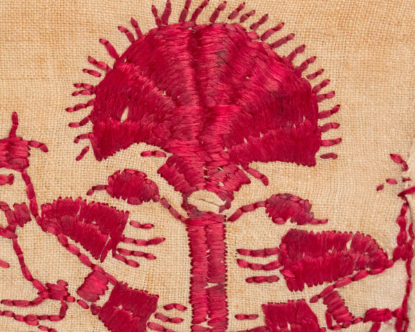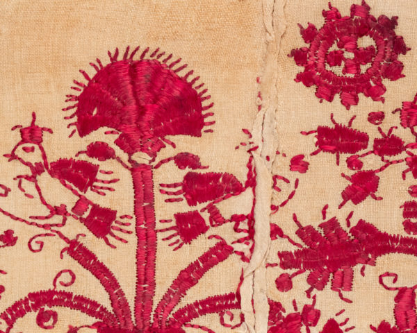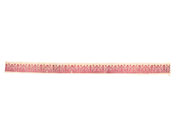 A white cotton skirt border embroidered with crimson red silk depicting birds atop flowering shrubs.