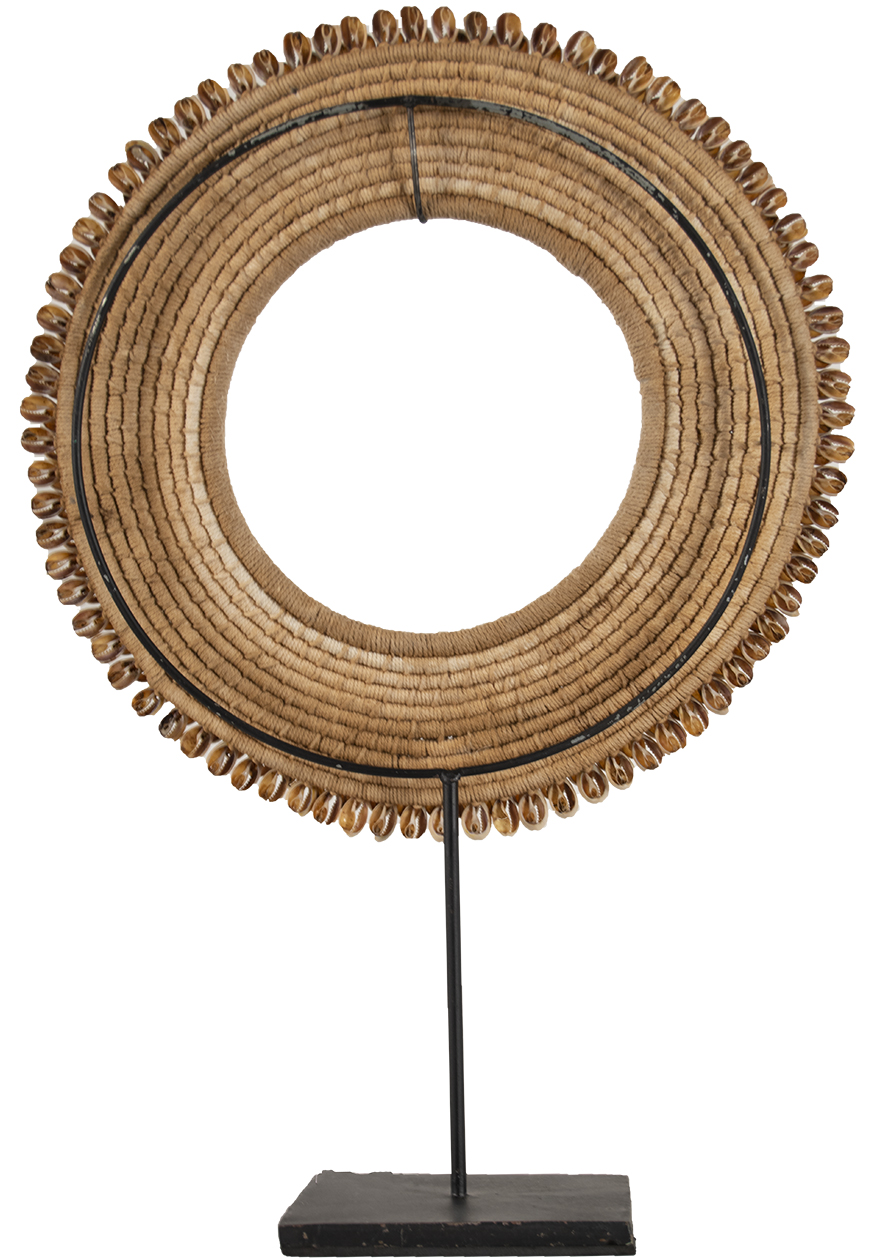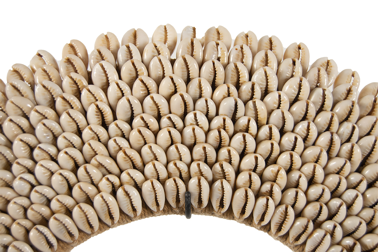 This Papua New Guinea Shell sphere is made by the Tolai people on the island of New Britain. This piece is referred to as a Tabu and was used as currency in New Britain. It is comprised of overlapping circles made of hundreds of small cowrie shells all sewn onto a basketry foundation.