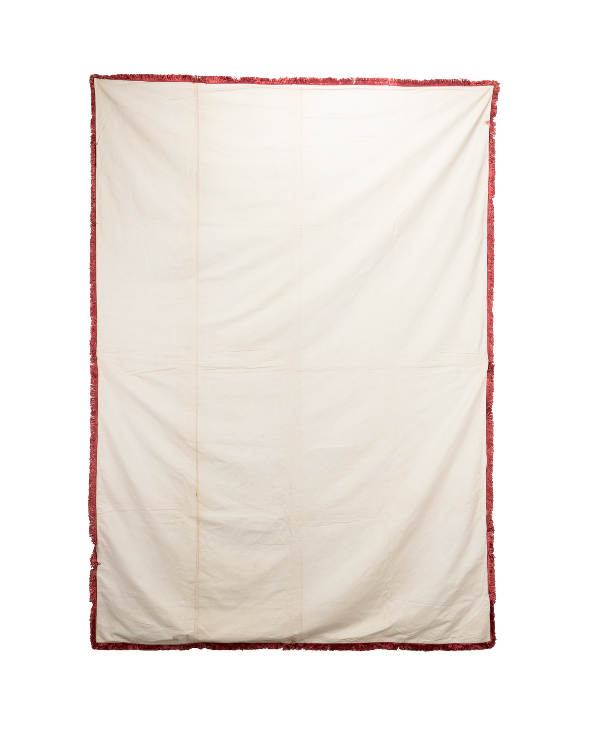 Polychromatic silk embroidered florals and vines cover most of the white cotton ground. A central medallion is surrounded by a floral field surrounded by three borders.The piece is finished on the edges with a pink silk fringe.
