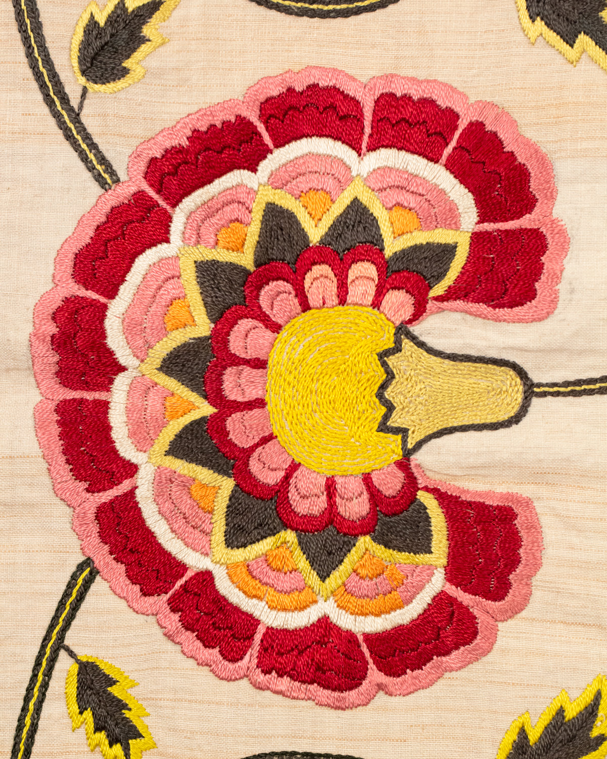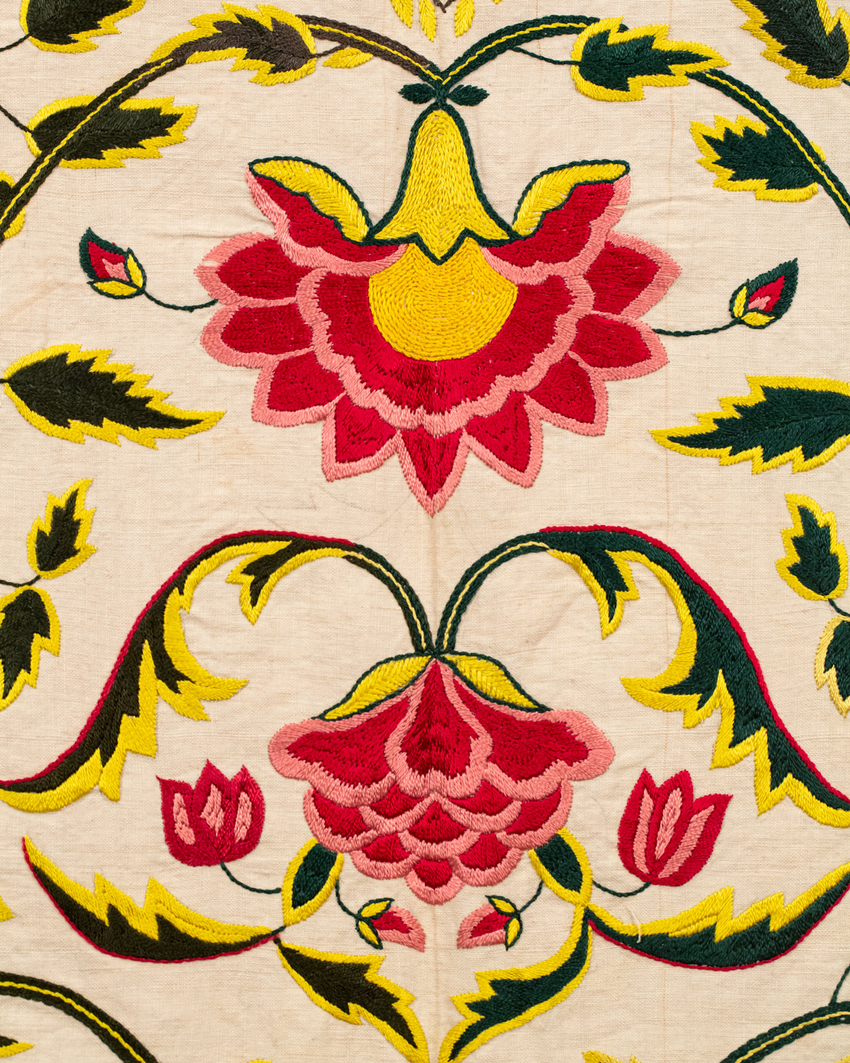 Textiles in this style were made by embroiderers in Deccan for the local sultanates as well as for export to Europe. One of the most common trade routes to Europe was through the Portuguese port in Goa, and so these textiles are sometimes mislabeled as being “Goan” or “Indo-Portuguese.”