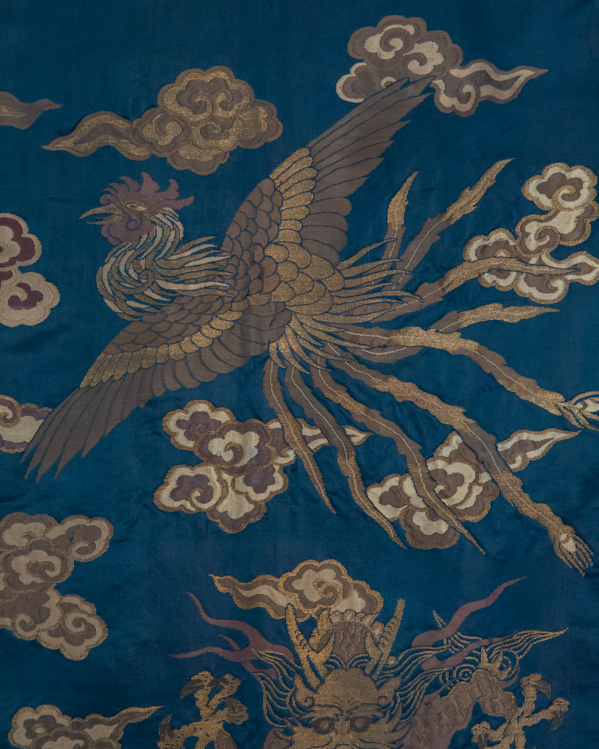 The dragon and phoenix (fenghuang) are two important symbols in Chinese culture. The dragon brings strength, power, and good luck, while the phoenix brings grace and high virtue. The dragon represents masculinity, and the phoenix represents femininity, and together they create balance. There are six dragons and two phoenixes amid cloud bands and above celestiallandscape. The entire piece is framed with a gold border.