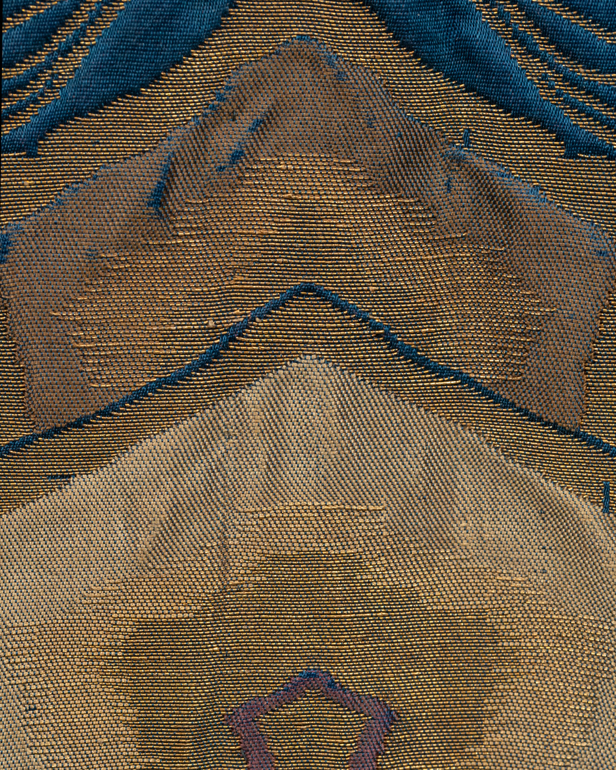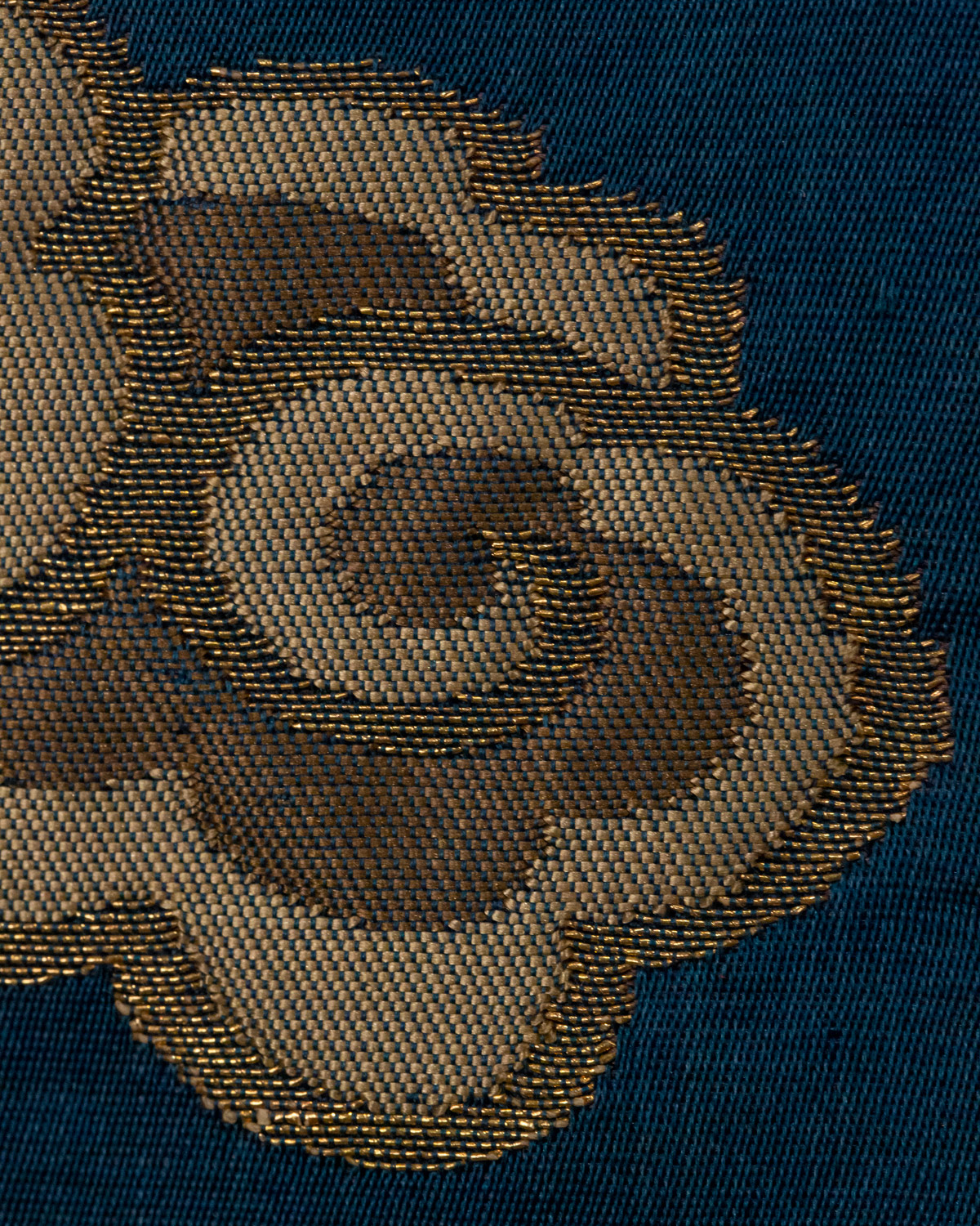 This piece is silk woven with the brocading of metallic threads done in a continuous supplementary weft.