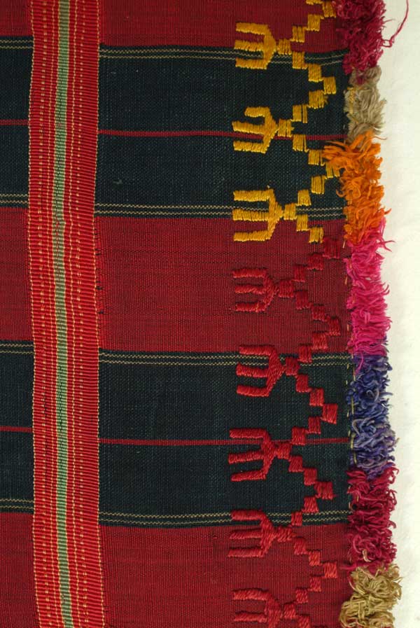 A three paneled shawl of dark blue cotton and red silk stripes. This shawl’s weave is supplemented with embroidered Kohistani-Swati motifs.
