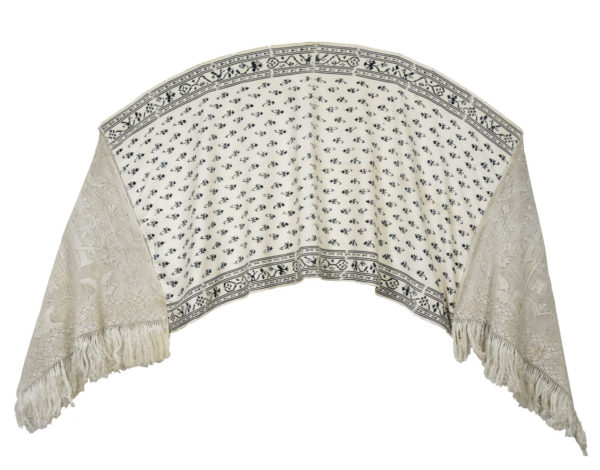Shawls from this area are of cotton yarn, warp-resist indigo dyed, with knotted macrame fringe. They typically have a 60-90 centimeter (two to three foot) undyed fringe at each end with designs made by tying the warp together in overhand knots. A few shawls have fringe made in crochet, or a square mesh knotted net(single element, filet) with embroidered motifs. Motifs include flowers, birds, the seal of Ecuador, dates, boats, and sometimes the weaver’s name.