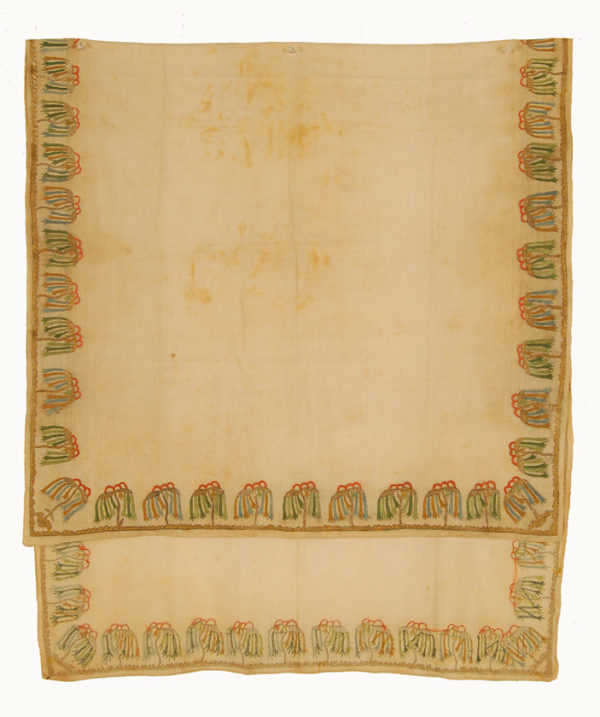 A cover of rectangular shape made of linen and decorated along its borders with trees that look a lot like weeping willows. The embroidery is done in chain stitched polychrome silk and metallic thread.
