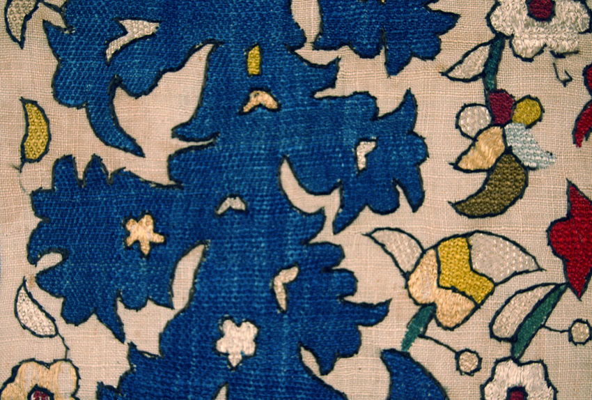 Algeria is famous for its floral embroidery used for scarves, blouses, bath towels, hangings and curtains. After Algiers was incorporated into the Ottoman empire in the early 1500s, its embroidery began to show many similarities to that of Istanbul and Smyrna. Its floral motifs are similar to the pomegranate or artichoke patterns but also influenced by Persian, Syrian and Italian work. Tulips, carnations, hyacinths and wild roses were all recurrent motifs. Counted brick stitch with blocs of colors outlined in black silk, all done on dense plain weave cotton ground.