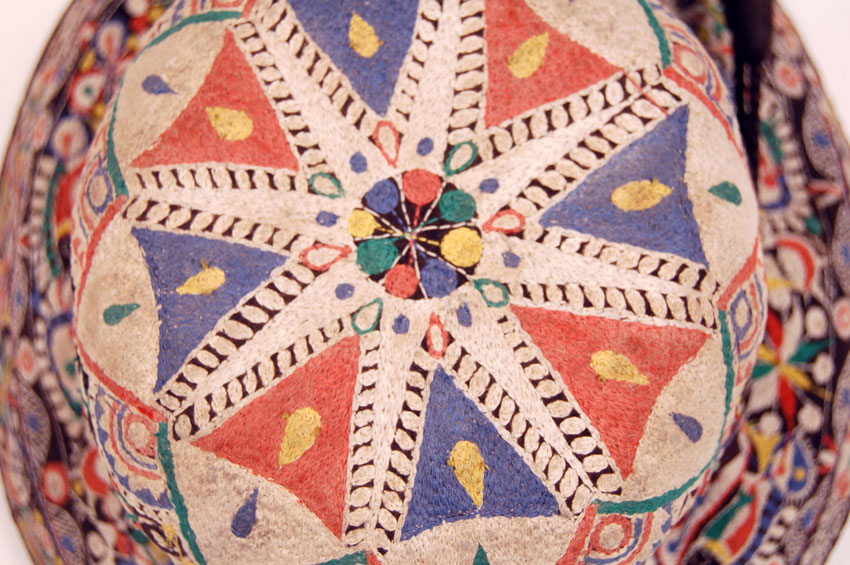 Peruvian hat made of felt bowler style with the brim pushed down. The surface of felt is almost completely cover with polychrome embroidery The embroidered motifs are mostly farm related like fruit, birds and fish and the work, done with a manually operated sewing machine is still quite remarkable. Worn by women of the village of Chivay.