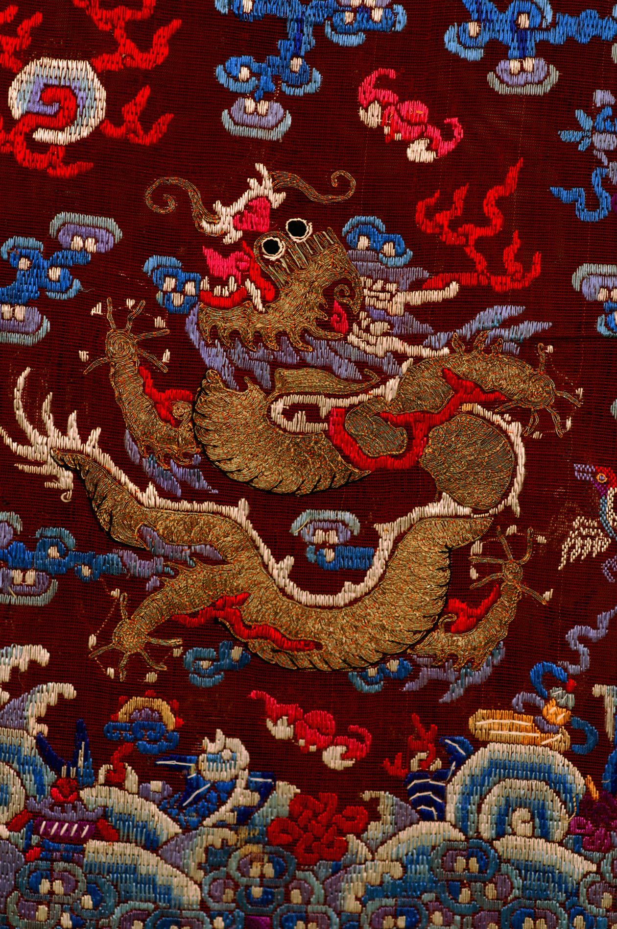 This embroidered gauze robe is a formal men’s summer robe is from the early 20th century. It features silk gauze fabric, a front overflap closing to the right, and tapered sleeves ending with flared cuffs. The design is a celestial landscape with nine five-clawed, two-horned dragons, water, mountains, birds, , gold and black edging, Li-Shui stripes, all executed on purple gauze ground.