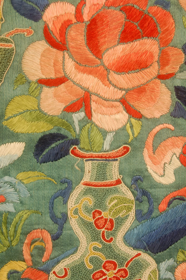 This embroidered green silk skirt was made in China in the 19th century. This skirt is made out of green silk satin embroidered on the front and back panels with polychrome flowers, decorated vases, flying bats, and other auspicious motifs.