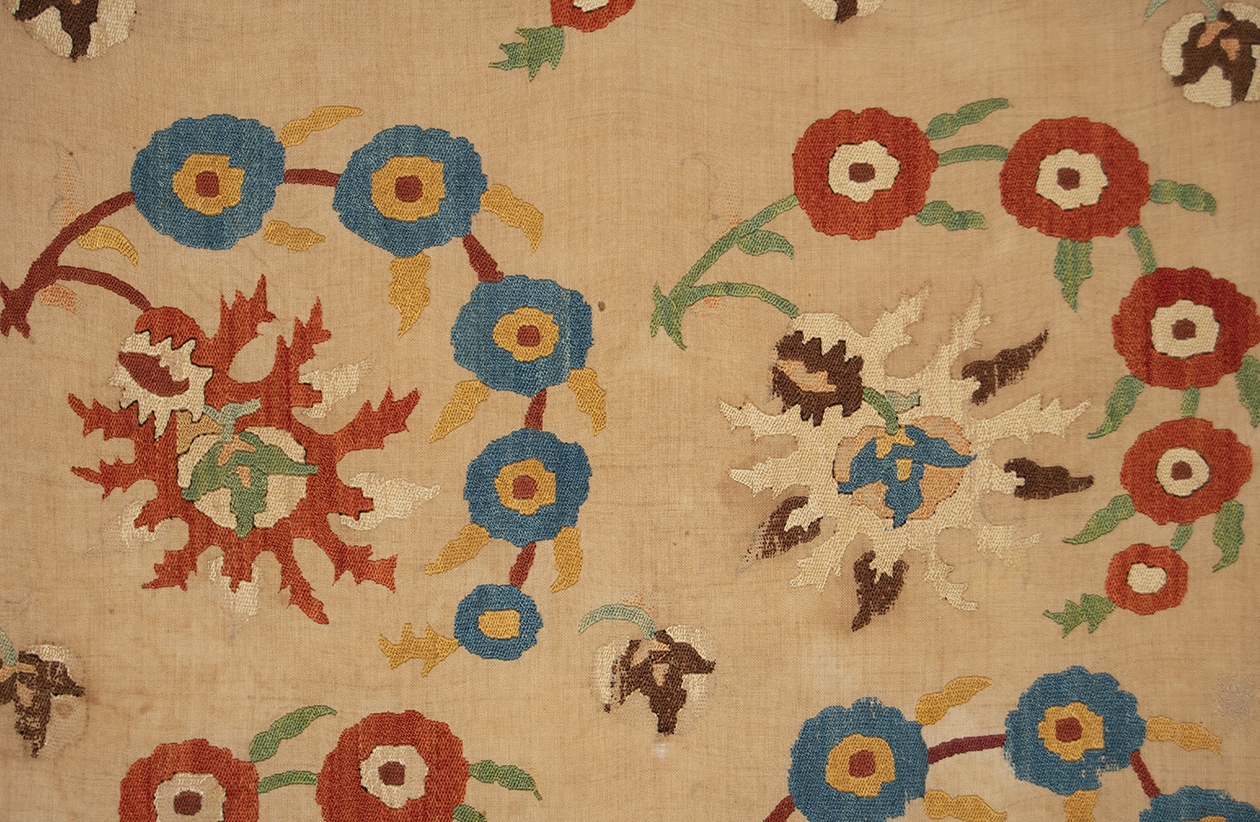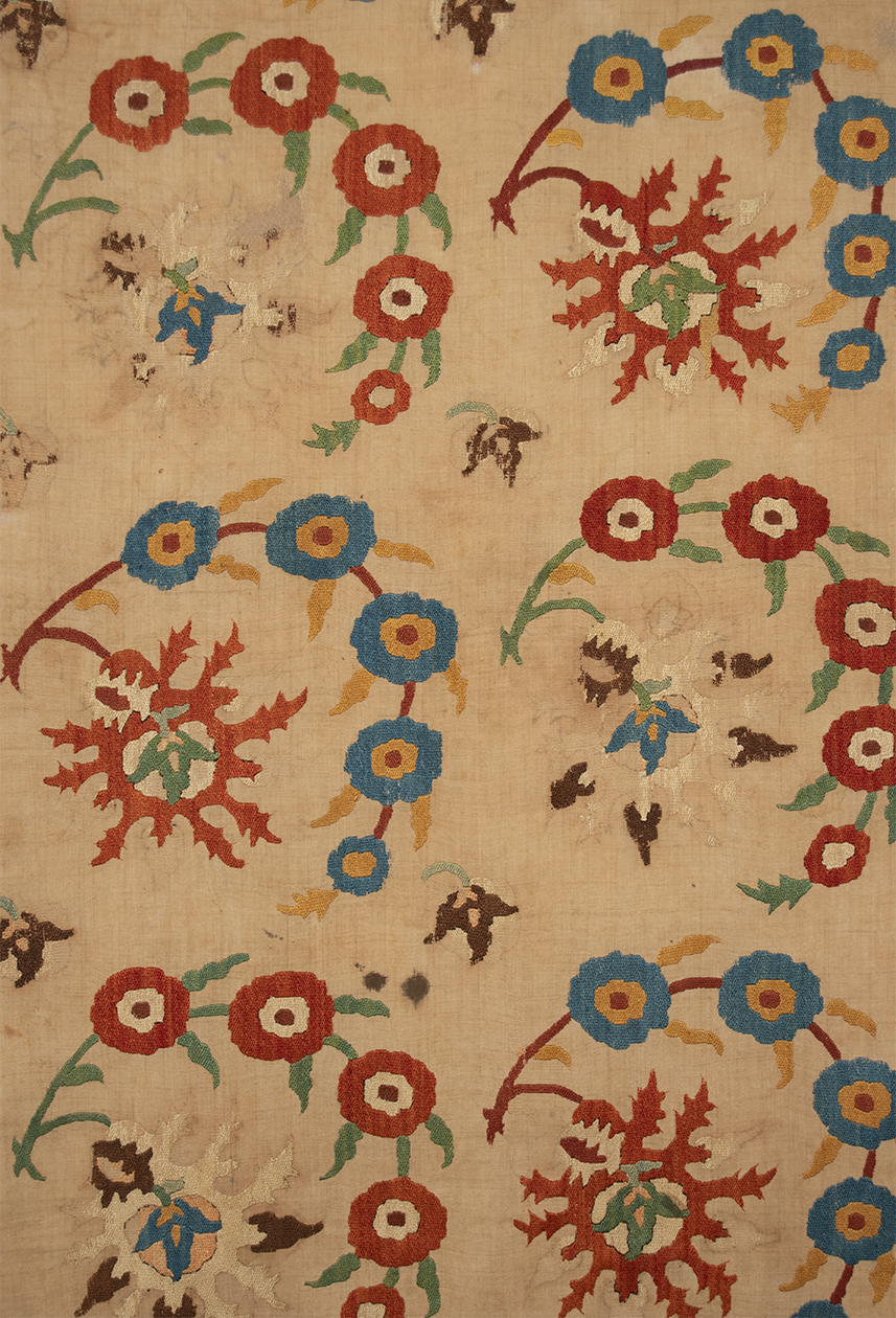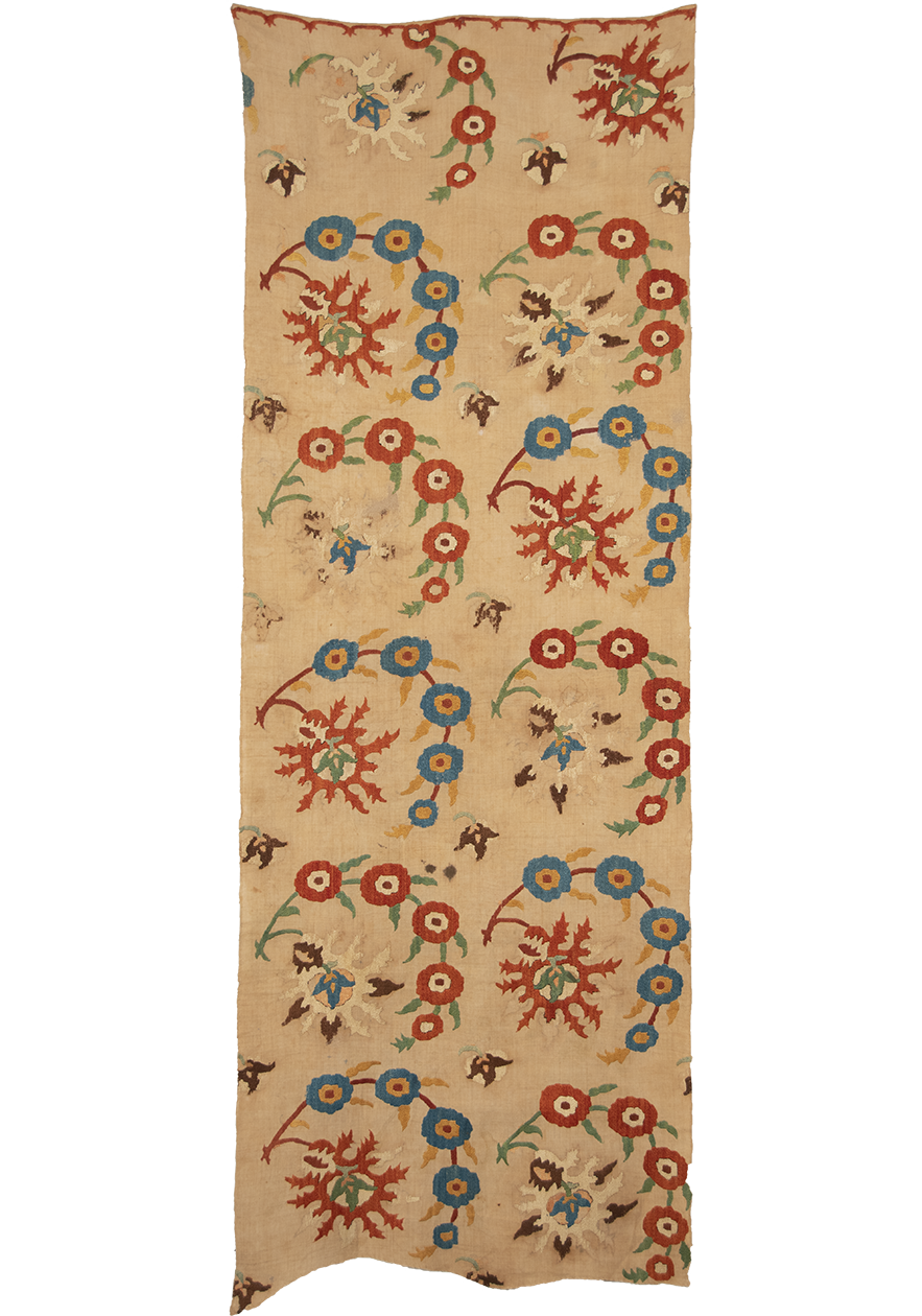 Selvedge to selvedge linen panel with a field of flower-sprays, each bearing palmettes and rosettes on elegant curving stems. Probably part of a panel of a larger cover. Nine color silk embroidered on plain weave linen, running stitch in diagonal alignment.