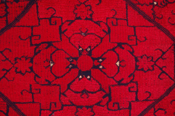 The embroidery produced in the northern Pakistan area of the Swat valley is similar to the phulkari of Hazara and the Punjab- long stitches of floss silk create shiny reflective surfaces. However, there are some differences: the Punjabi phulkaris are embroidered on reddish brown cotton, their embroidery threads are mostly gold, yellow and white and their design less complex, while the Swatti ones are on black ground, with mostly pink and red silk threads and their design is more complex and rich with tribal motifs. That swat region embroidery is also done on other articles the beside shawls, such as dresses and pillowcases like this example.