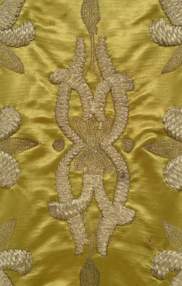 Runner of green satin; decorated with metallic thread embroidery. The use of two types of stitching: chain stitch and couching stitch creates a complex texture. the design is of a border of meandering and interlocking vines with two small center medallions.Additional metallic thread crocheted border.